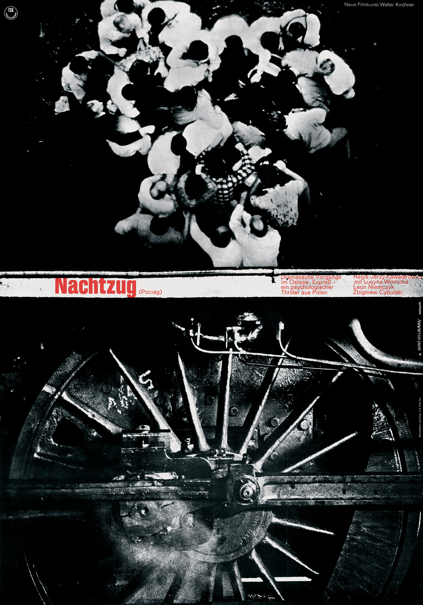 The poster for »Night Train«, a Polish film, consists of a shot from the screen and a photo taken in Frankfurt. You can see how long ago that was. At that time I went to the main train station with my Rollei and photographed a departing locomotive. While experimenting with different photos I recognized a certain similarity between the two forms and the dramatic quality of the composition. (Hans Hillmann)