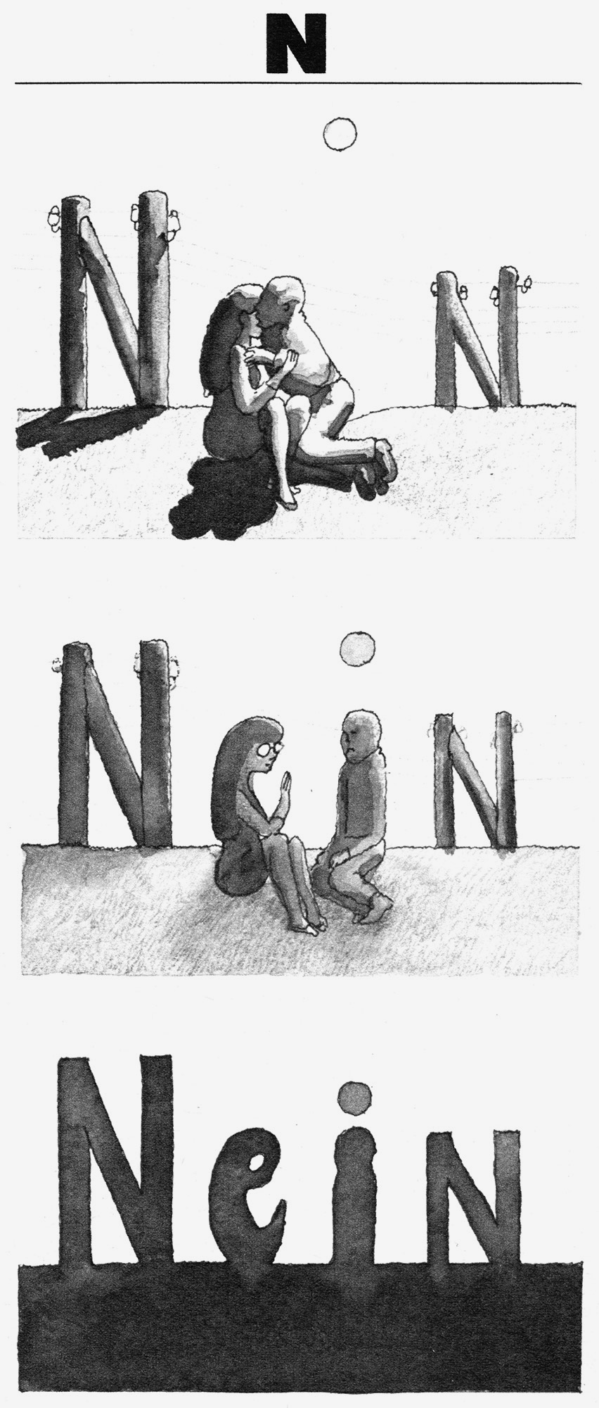 ABC Geschichten – NJahr: 1980Medium: MagazinillustrationTechnik: TiefdruckAuftraggeber: Frankfurter Allgemeine MagazinOrt: Frankfurt am MainAbgedruckt im »FAZ Magazin« Nr. 23. Art Direktion: Willi Fleckhaus.