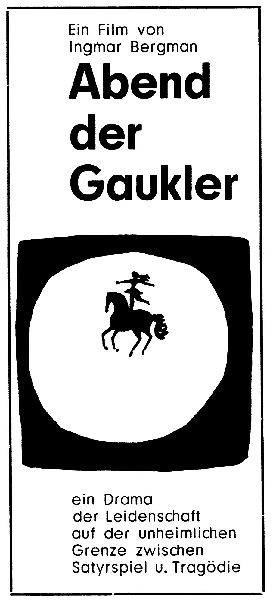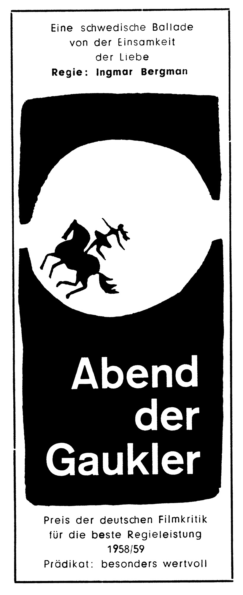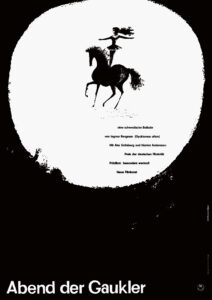 Abend der Gaukler (Anzeigen)Jahr: 1958Medium: AnzeigeTechnik: BuchdruckAuftraggeber: Neue Filmkunst Walter KirchnerOrt: GöttingenKeine Beschreibung