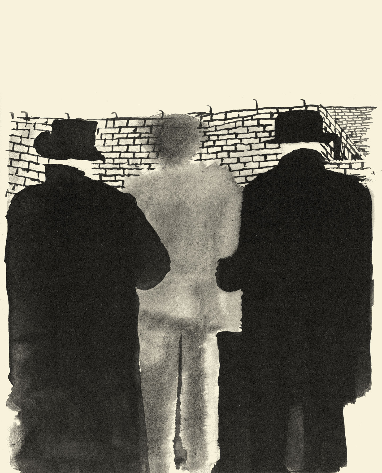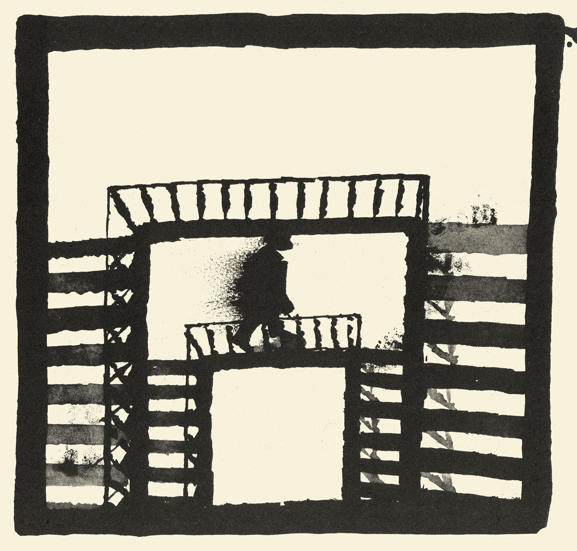 Agatha Christie – Die Zeugin der AnklageJahr: 1964Medium: IllustrationAuftraggeber: Die Brücke, Hoechst AGOrt: Frankfurt am MainAbgedruckt in »Die Brücke«, Firmenzeitschrift der Hoechst AG.