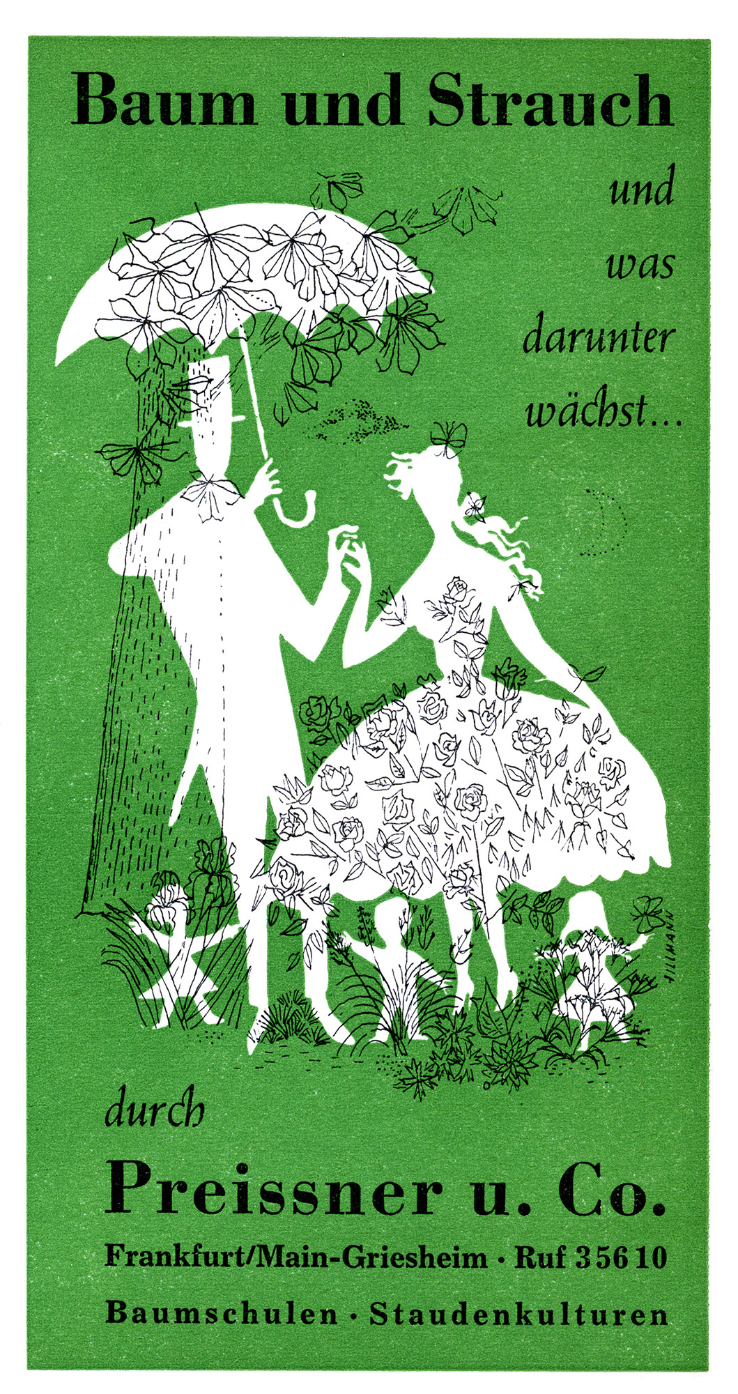 Baum und StrauchJahr: 1955Medium: AnzeigeMaße: 10x18,5 cmTechnik: BuchdruckAuftraggeber: Preissner und Co.Ort: KasselErschienen in einem von Hillmann gestalteten Katalog zur Bundesgartenschau Kassel 1955.