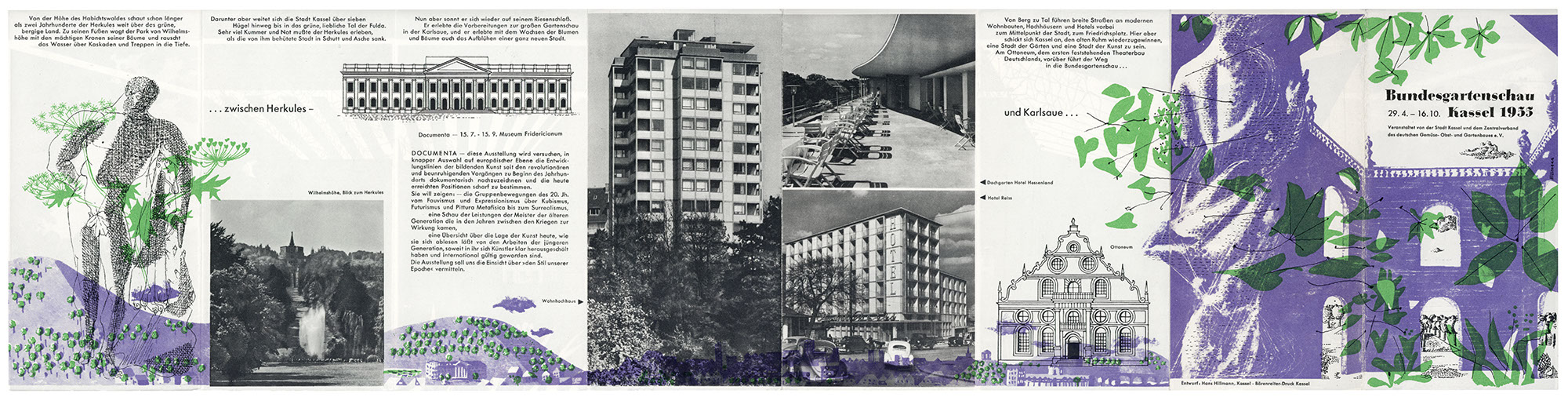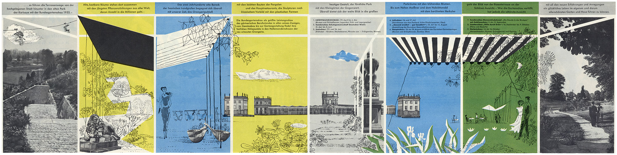 Bundesgartenschau KasselJahr: 1955Medium: FaltblattMaße: 21x10 cmTechnik: BuchdruckAuftraggeber: Bundesgartenschau KasselOrt: KasselKeine Beschreibung