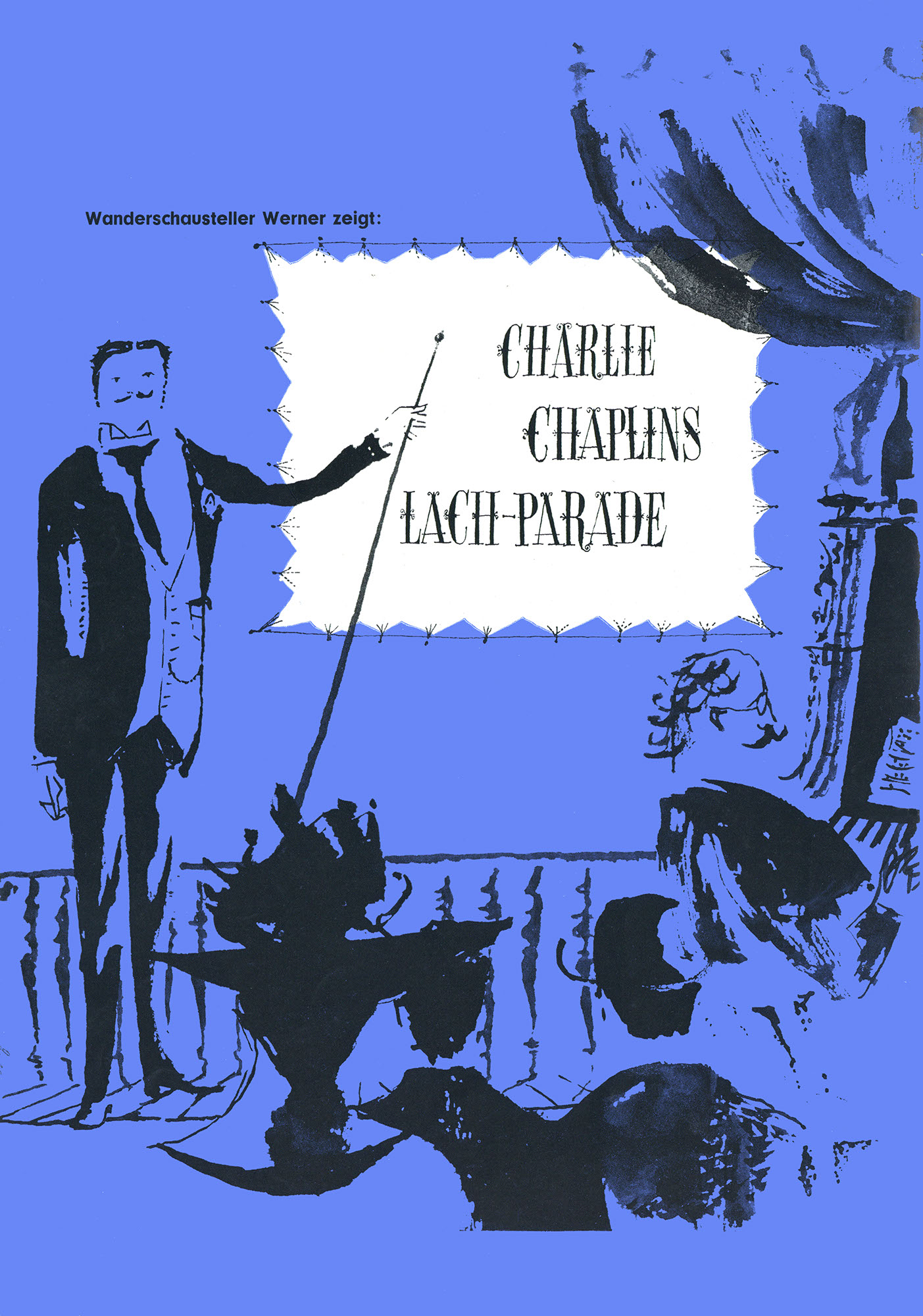 Chaplins Lachparade (Titelseite)Jahr: 1957Medium: IllustrationMaße: 21x29,7 cmTechnik: BuchdruckAuftraggeber: Neue Filmkunst Walter KirchnerOrt: GöttingenKeine Beschreibung