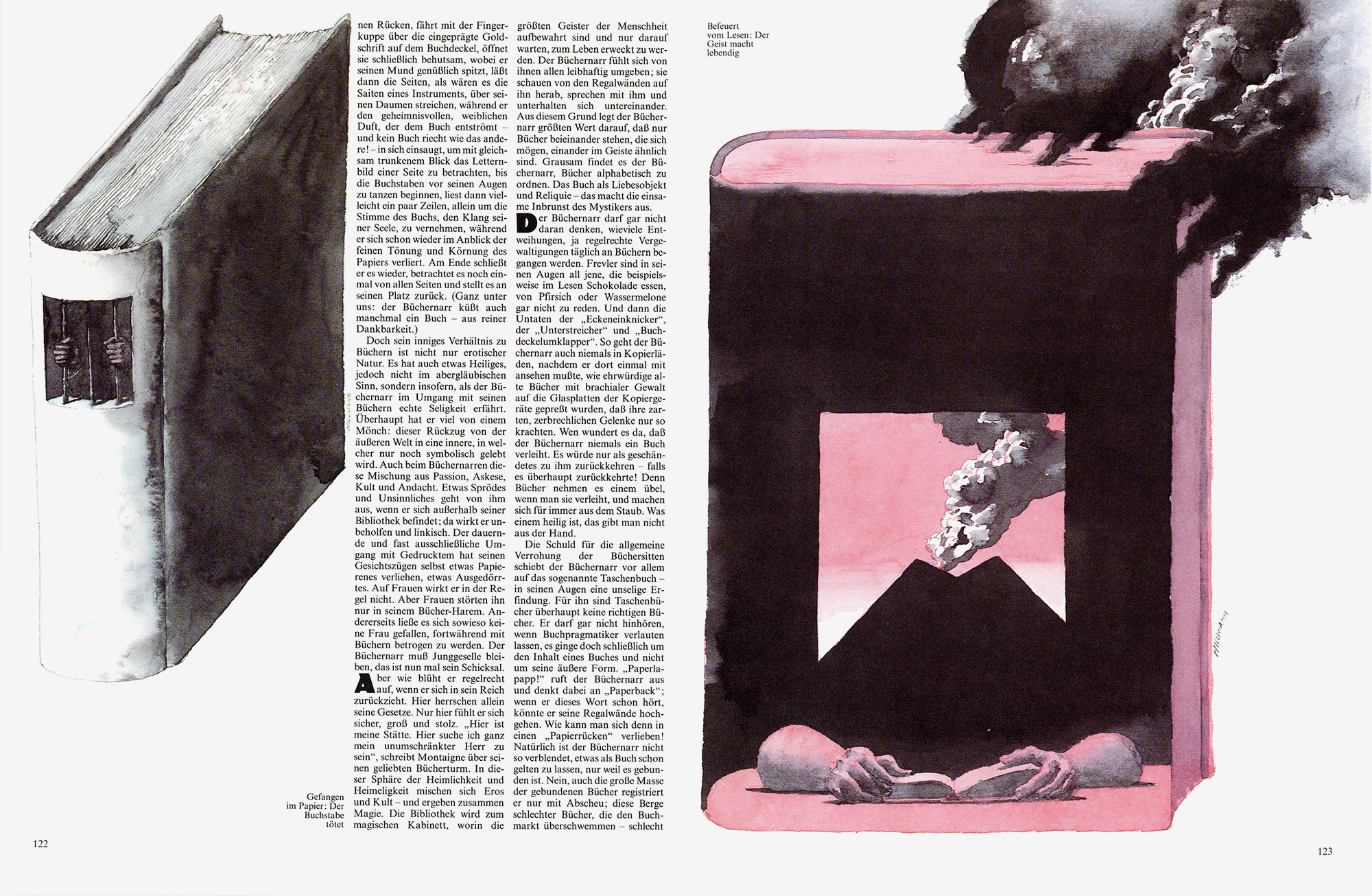 Charakterbilder – Der BüchernarrJahr: 1987Medium: MagazinillustrationTechnik: TiefdruckAuftraggeber: Frankfurter Allgemeine MagazinOrt: Frankfurt am MainAus der Serie »Charakterbilder«. Abgedruckt im »FAZ Magazin«. Art Direktion: Hans-Georg Pospischil.