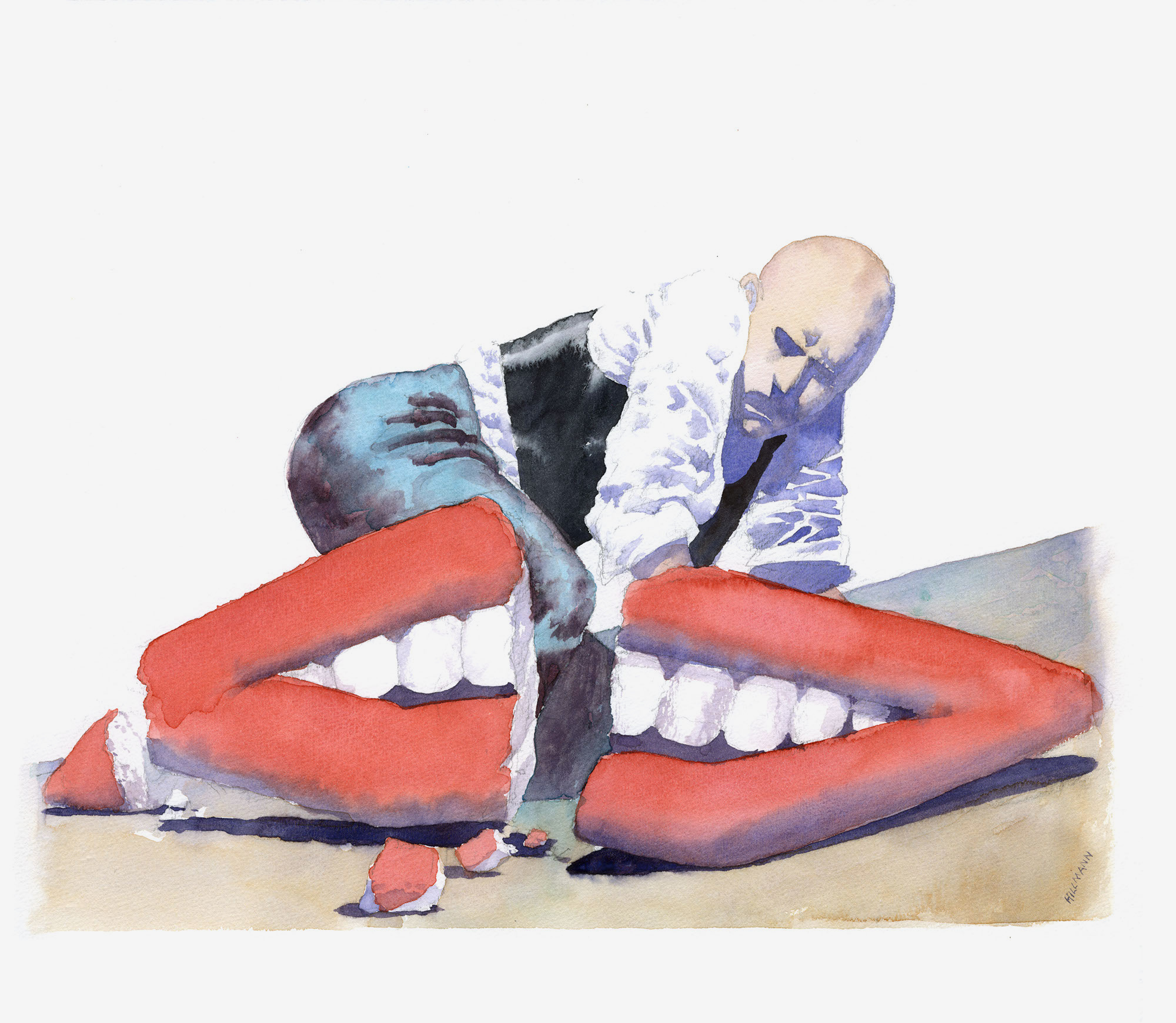 Charakterbilder – Der UngeschickteJahr: 1987Medium: MagazinillustrationTechnik: AquarellzeichnungAuftraggeber: Frankfurter Allgemeine MagazinOrt: Frankfurt am MainAus der Serie »Charakterbilder«. Abgedruckt im »FAZ Magazin«.