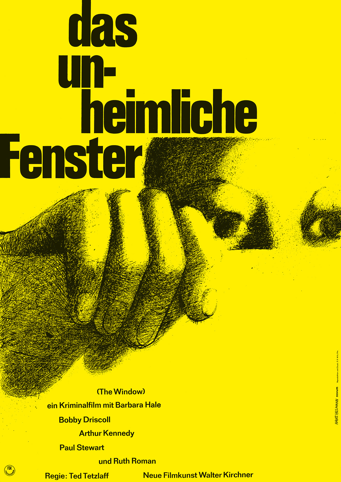 Das unheimliche FensterJahr: 1962Medium: PlakatMaße: 59,4x84,1 cm (DIN A1)Technik: OffsetdruckAuftraggeber: Neue Filmkunst Walter KirchnerOrt: GöttingenReprovorlage: Museum Folkwang – Deutsches Plakat Museum 32453/Foto: Jens Nober.