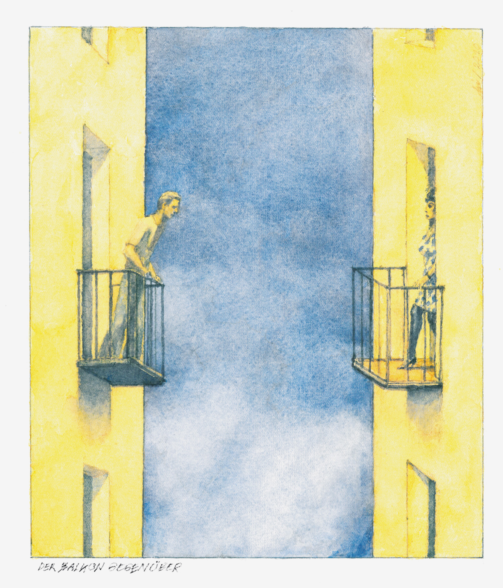 Der Balkon gegenüberJahr: 2010Medium: IllustrationMaße: 18x21 cmTechnik: AquarellzeichnungAuftraggeber: EigenauftragOrt: Frankfurt am MainKeine Beschreibung