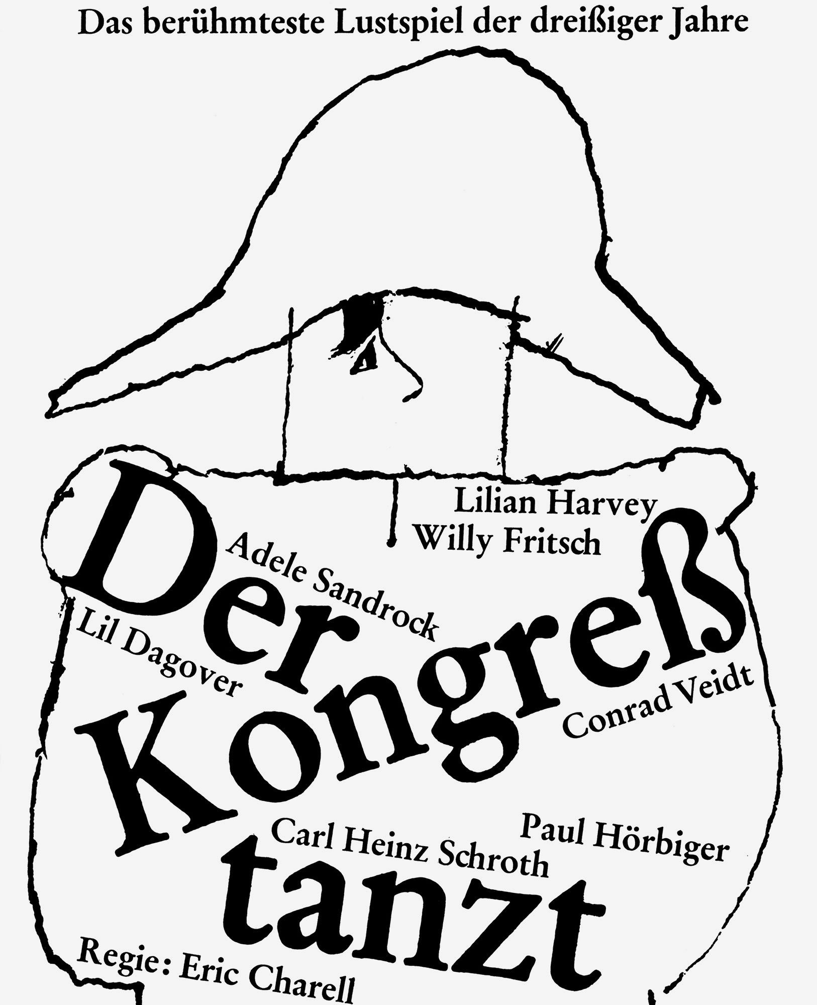 Der Kongress tanzt (Kleine Filmkunstreihe 41)Jahr: 1964Medium: BroschüreMaße: 18,5x23 cmTechnik: BuchdruckAuftraggeber: Neue Filmkunst Walter KirchnerOrt: GöttingenKeine Beschreibung