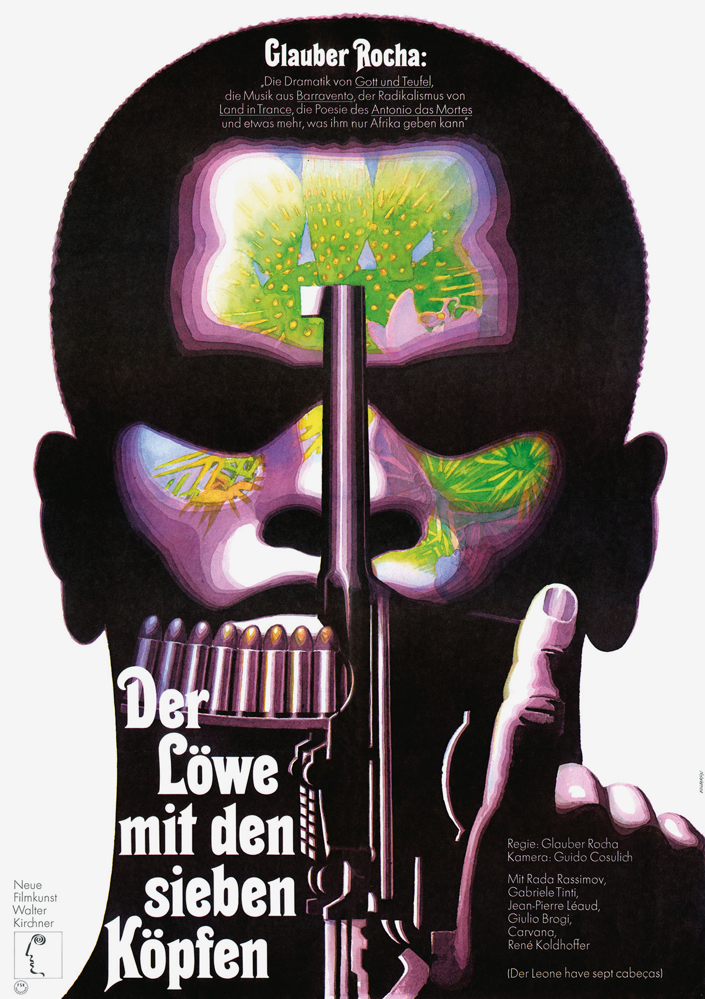 »Glauber Rochas Revolutionsepos Der Löwe mit den sieben Köpfen aus dem schwarzen Erdteil, seine Darstellung der Bedrohlichkeit grausamer Realität, werden hier durch ein prägnantes visuelles Symbol symbolisiert. Es dient auch als Denkanstoß. Die analytische Tendenz wird durch den Stirn- und Nebenhöhlen-Schnitt im Kriegerschädel vorzüglich angezeigt. Die Räume der Aufklappung zeigen grüne Kakteen-Pflanzen, Sinnbild nicht nur der Abwehr, sondern auch der Fruchtbarkeit und Ausdauer. Das Plakat erweist sich beim Fern-Test als vorzüglicher Blickfang, seine Darstellung prägt sich ein, sie gehört zu den vorzüglichen Arbeiten mit Zeitzündereffekt, im Nachsinnen verstärkt sich noch die Appellwirkung.« (Eduard Länger, Film-Echo / Filmwoche, Nr. 72 /1972)