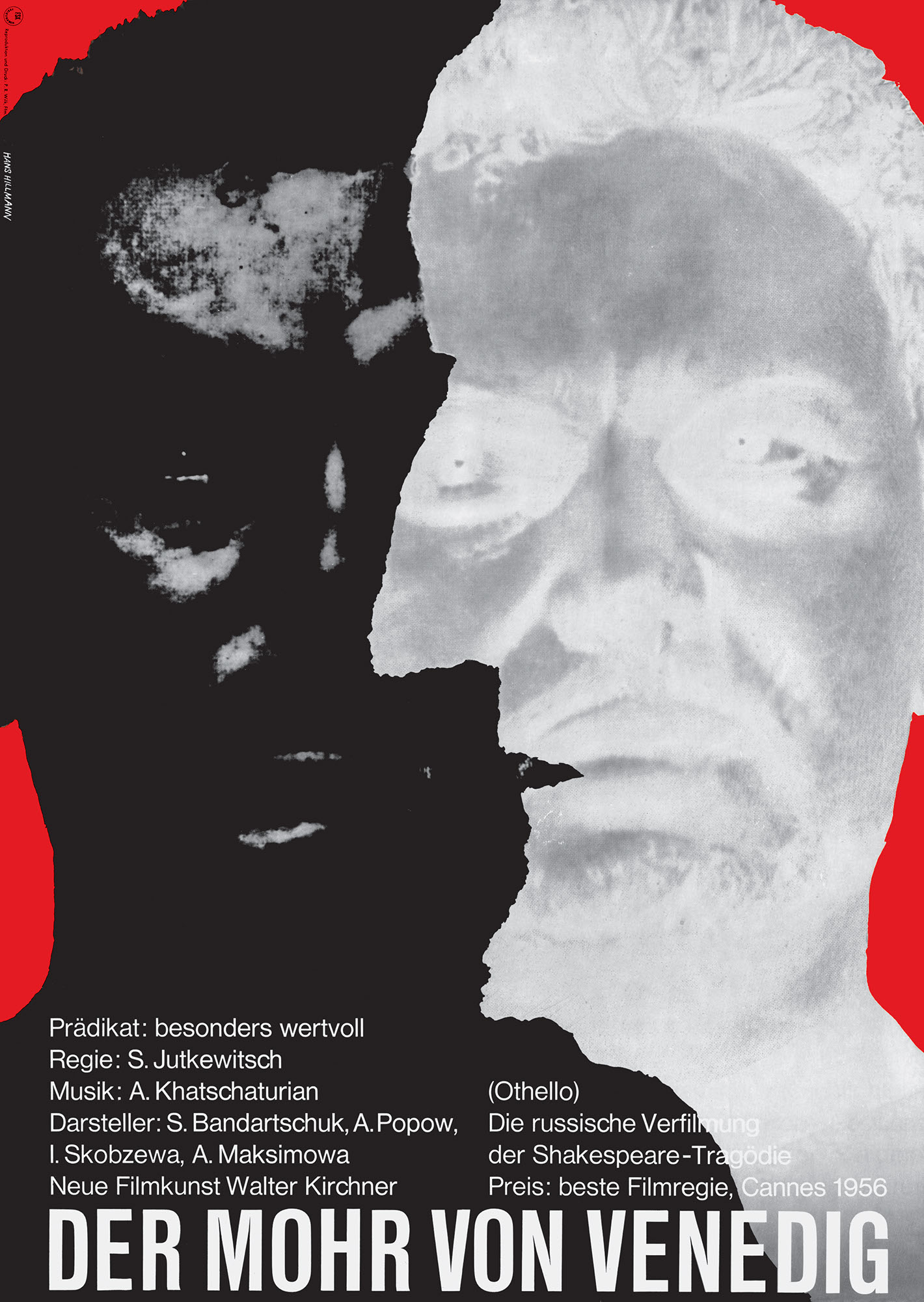 Der Mohr von VenedigJahr: 1964Medium: PlakatMaße: 59,4x84,1 cm (DIN A1)Technik: OffsetdruckAuftraggeber: Neue Filmkunst Walter KirchnerOrt: GöttingenKeine Beschreibung