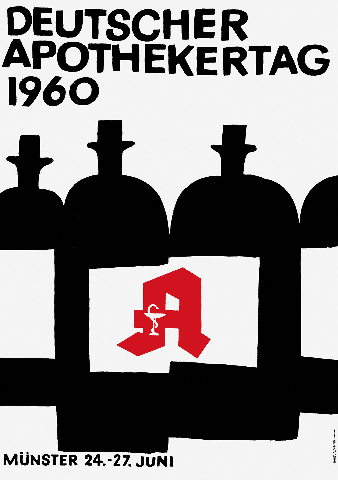 »Das Plakat für den Deutschen Apothekertag 1960 ging aus einem Wettbewerb hervor, zu dem acht namhafte Werbegraphiker aufgefordert waren. Obiger Entwurf in Schwarz und Rot von Hans Hillmann, Frankfurt/Main, erhielt den ersten Preis und kommt zur Ausführung. Dieser Wettbewerb war gut dotiert und zeichnete sich durch seine sorgfältig zusammengesetzte Jury aus, zu der vier Fachleute zählten. Die Sitzung verlief in voller Harmonie, und man darf die Arbeitsgemeinschaft der Berufsvertretungen Deutscher Apotheker zu der tadellosen Durchführung ihres Wettbewerbes wie auch für das daraus hervorgegangene Plakat von Hans Hillmann herzlich beglückwünschen.«