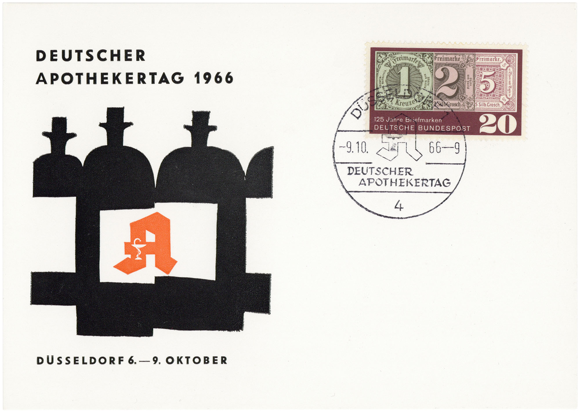 Deutscher Apothektertag 1966 (Ersttagsblatt)Jahr: 1966Medium: AnderesMaße: 15x11 cmTechnik: BuchdruckAuftraggeber: Arbeitsgemeinschaft der Berufsvertretungen Deutscher ApothekerOrt: Frankfurt am MainWeiterverwendung des 1960 von Hans Hillmann entwickelten Werbemotivs zum Deutschen Apothekertag.