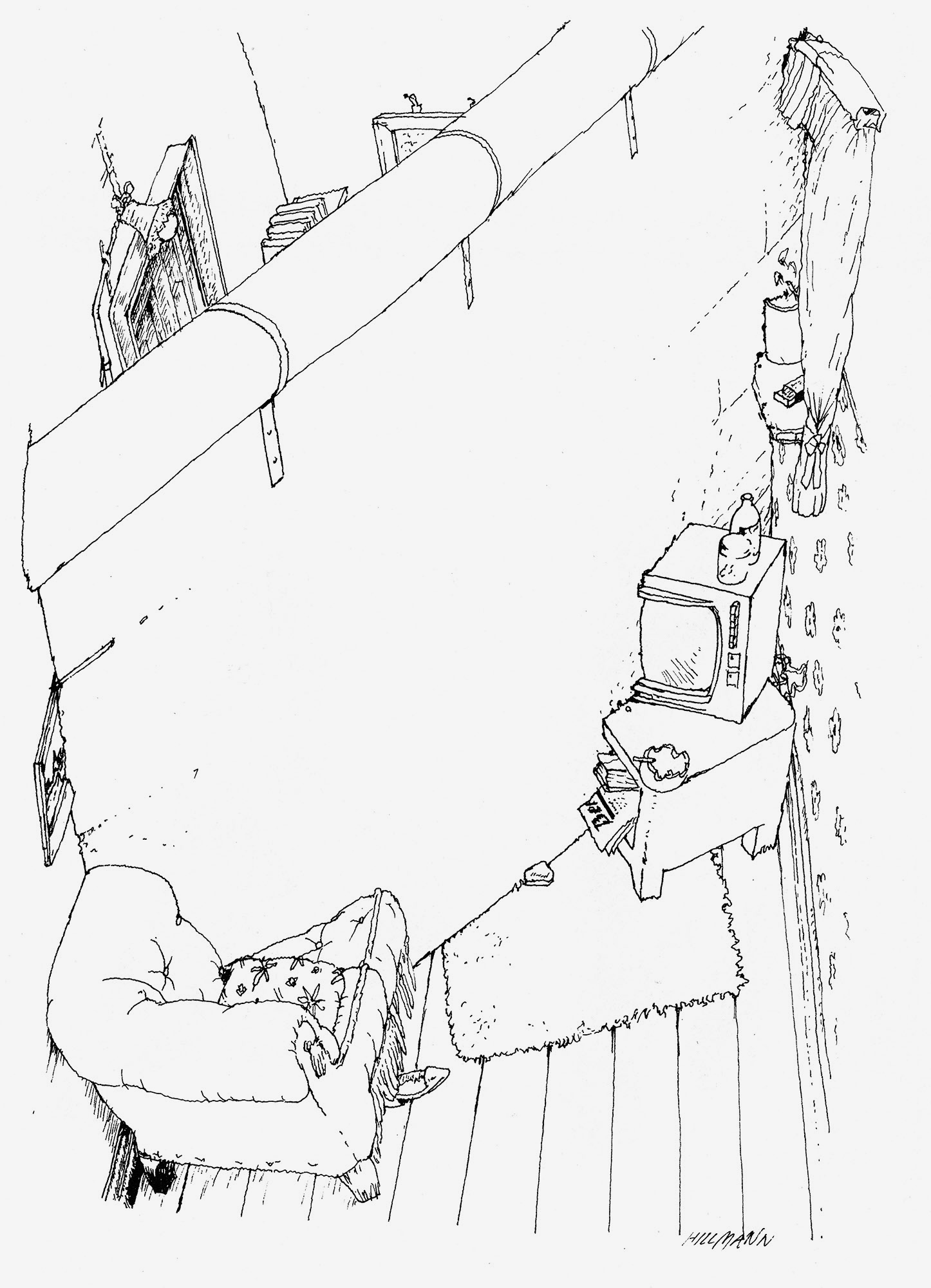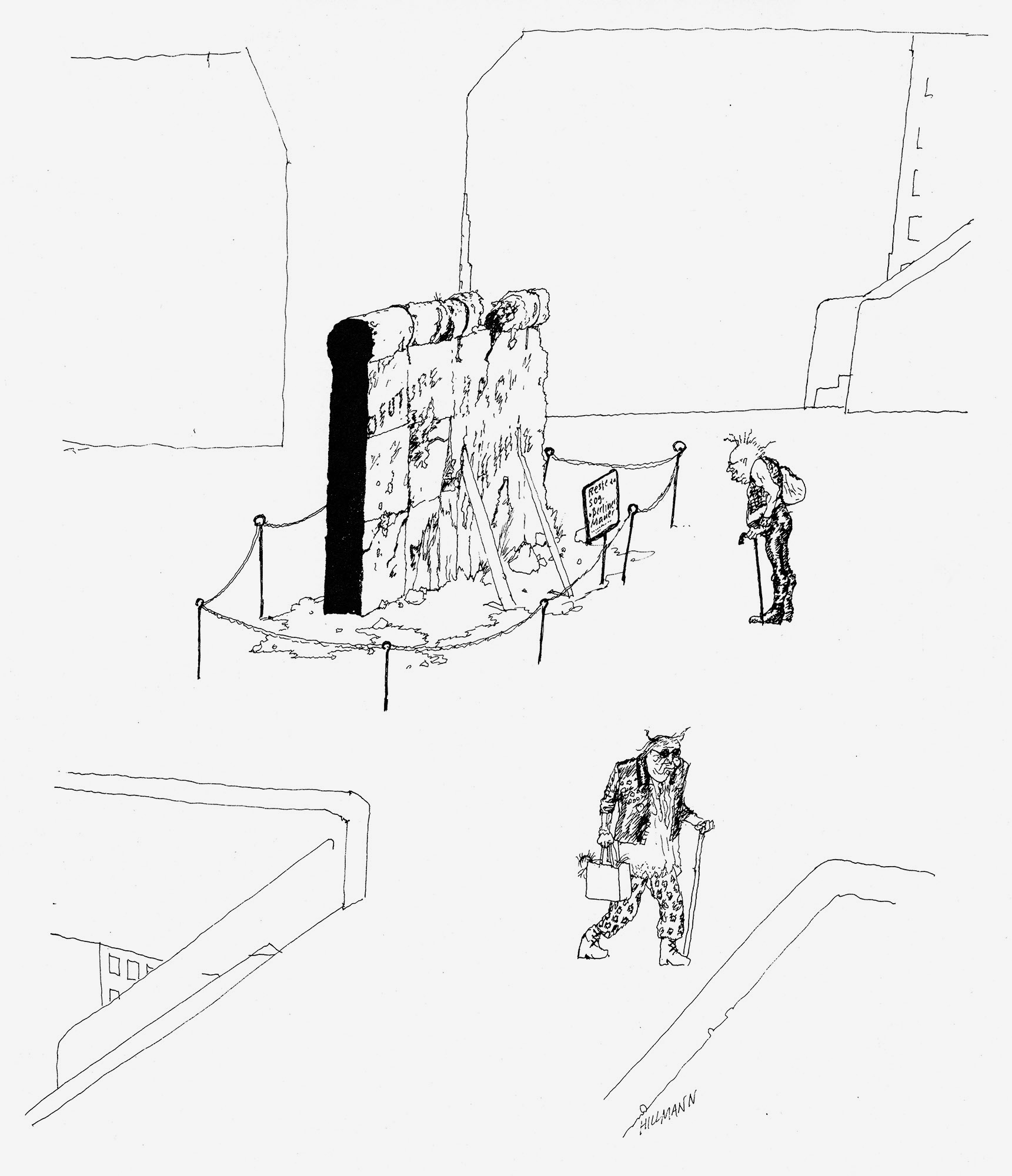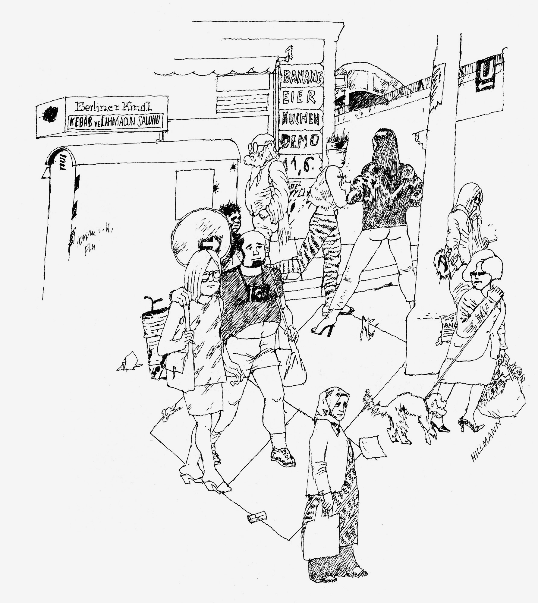 Die Entdeckung BerlinsJahr: 1984Medium: IllustrationMaße: 18x21 cmTechnik: TuschezeichnungAuftraggeber: Verlag Haude und SpenerOrt: BerlinBeiträge für das Buchprojekt »Die Entdeckung Berlins. 14 Cartoonisten sehen die Stadt«
