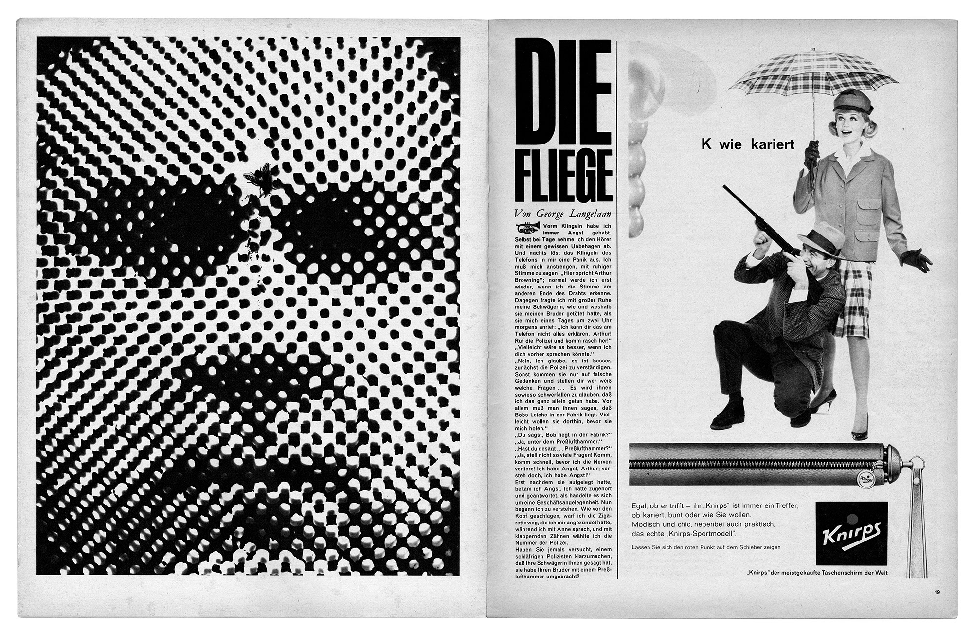 Die FliegeJahr: 1963Medium: MagazinillustrationMaße: 52x33,5 cmTechnik: TiefdruckAuftraggeber: TwenOrt: KölnAus twen Nr. 07-1963. Art Director: Willy Fleckhaus.