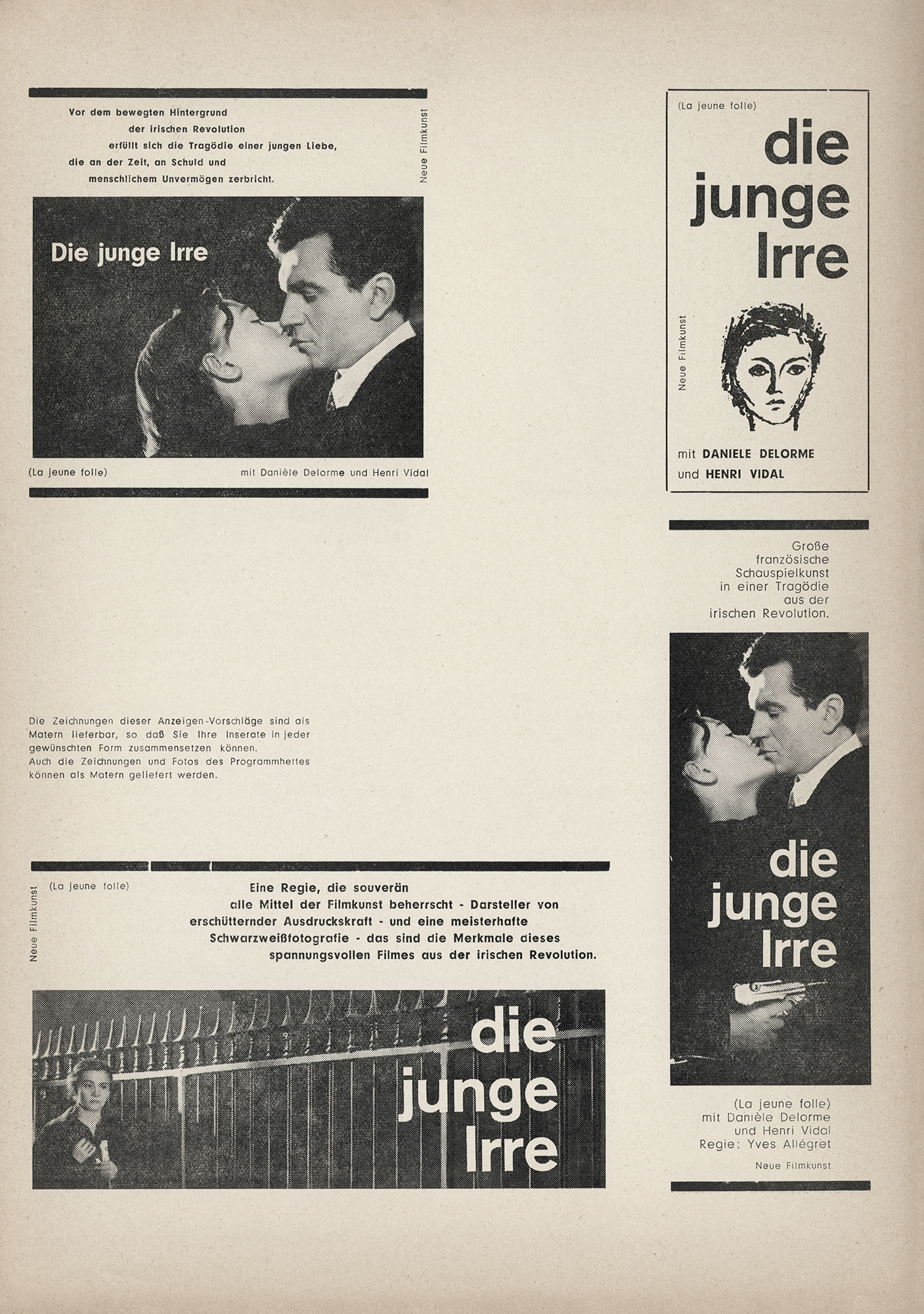 Die junge Irre (Werberatschlag)Jahr: 1957Medium: BroschüreMaße: 21x29,7 cmTechnik: BuchdruckAuftraggeber: Neue Filmkunst Walter KirchnerOrt: GöttingenKeine Beschreibung