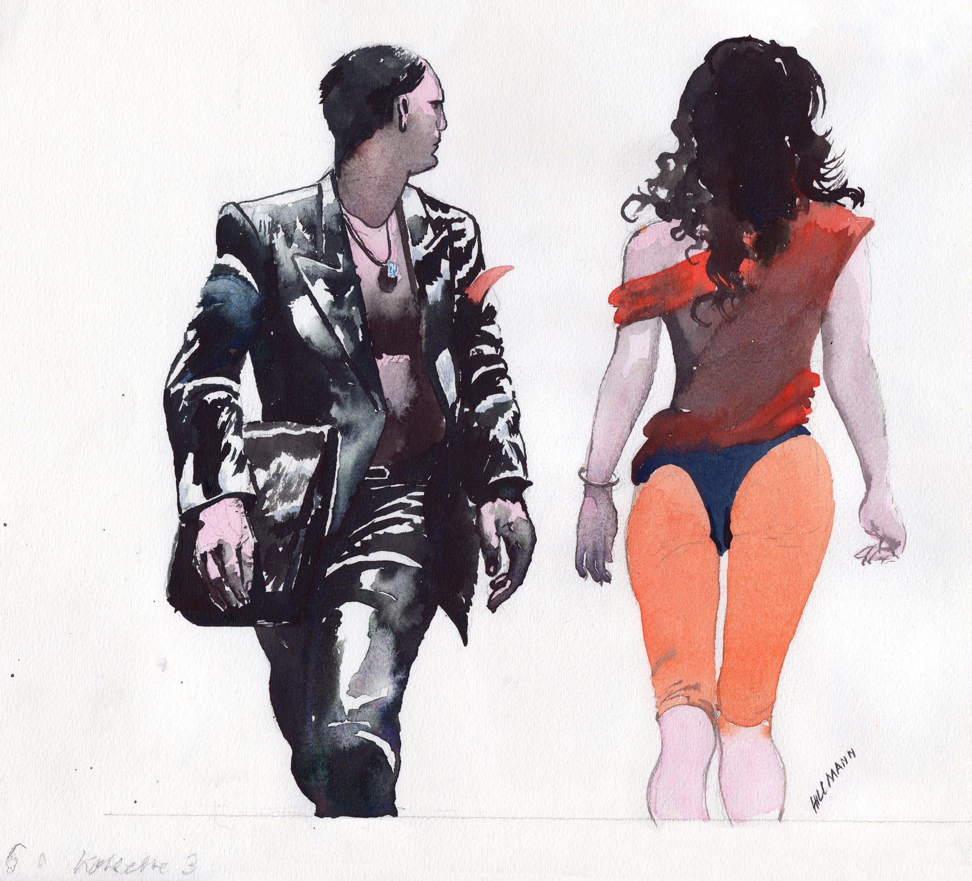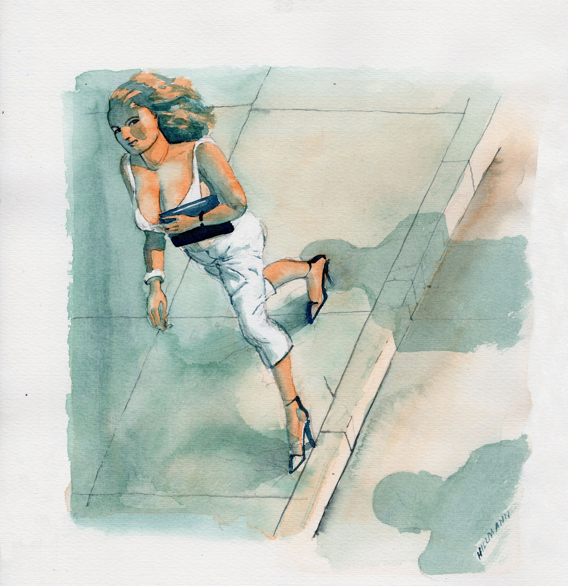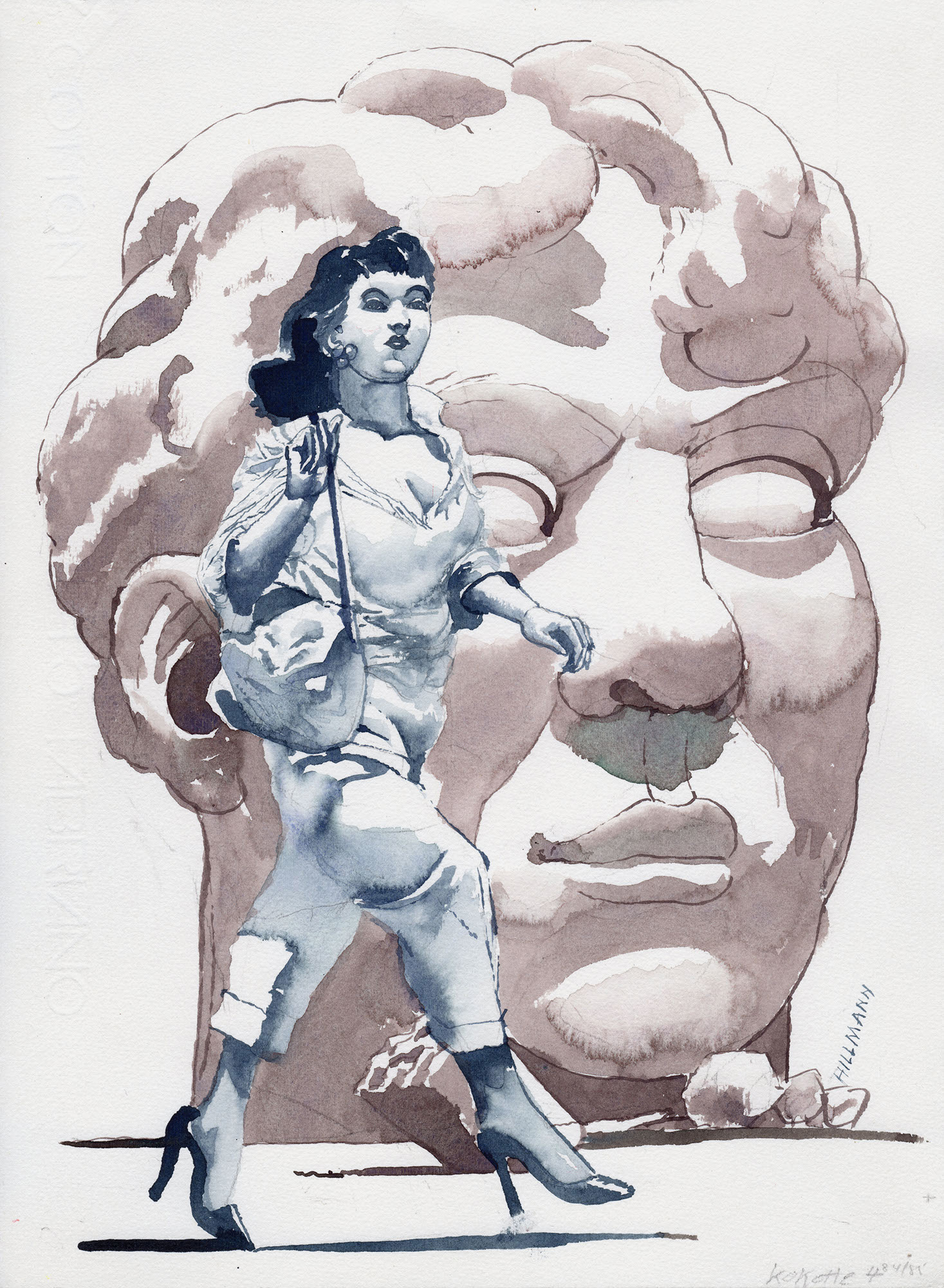 Charakterbilder – Die KoketteJahr: 1980Medium: MagazinillustrationMaße: 22,5x23 cmTechnik: AquarellzeichnungAuftraggeber: Frankfurter Allgemeine MagazinOrt: Frankfurt am MainAus der Serie »Charakterbilder«.