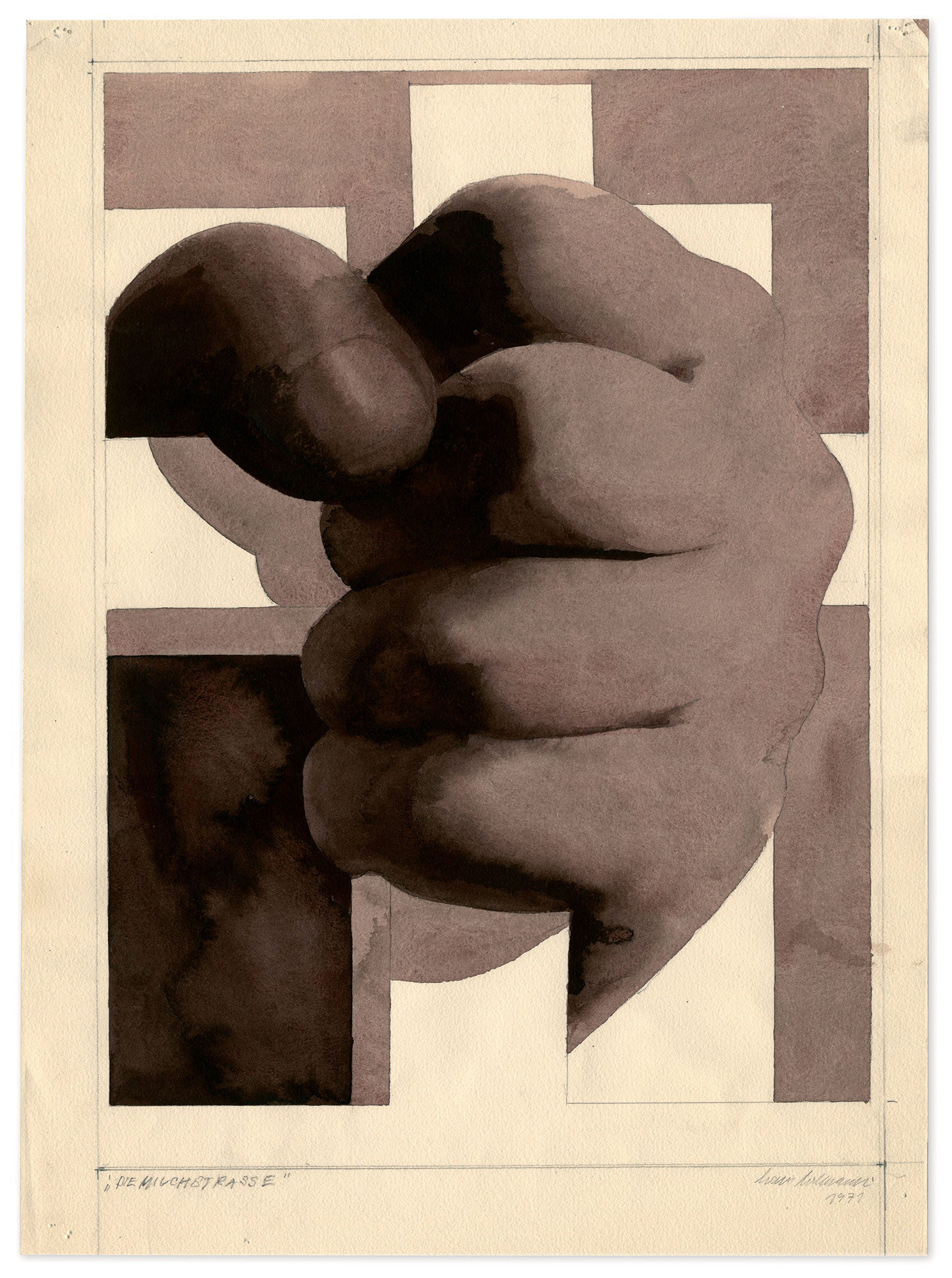 Die Milchstrasse (Entwurf)Jahr: 1969Medium: EntwurfMaße: 25x33 cmTechnik: AquarellzeichnungAuftraggeber: Neue Filmkunst Walter KirchnerOrt: GöttingenKeine Beschreibung