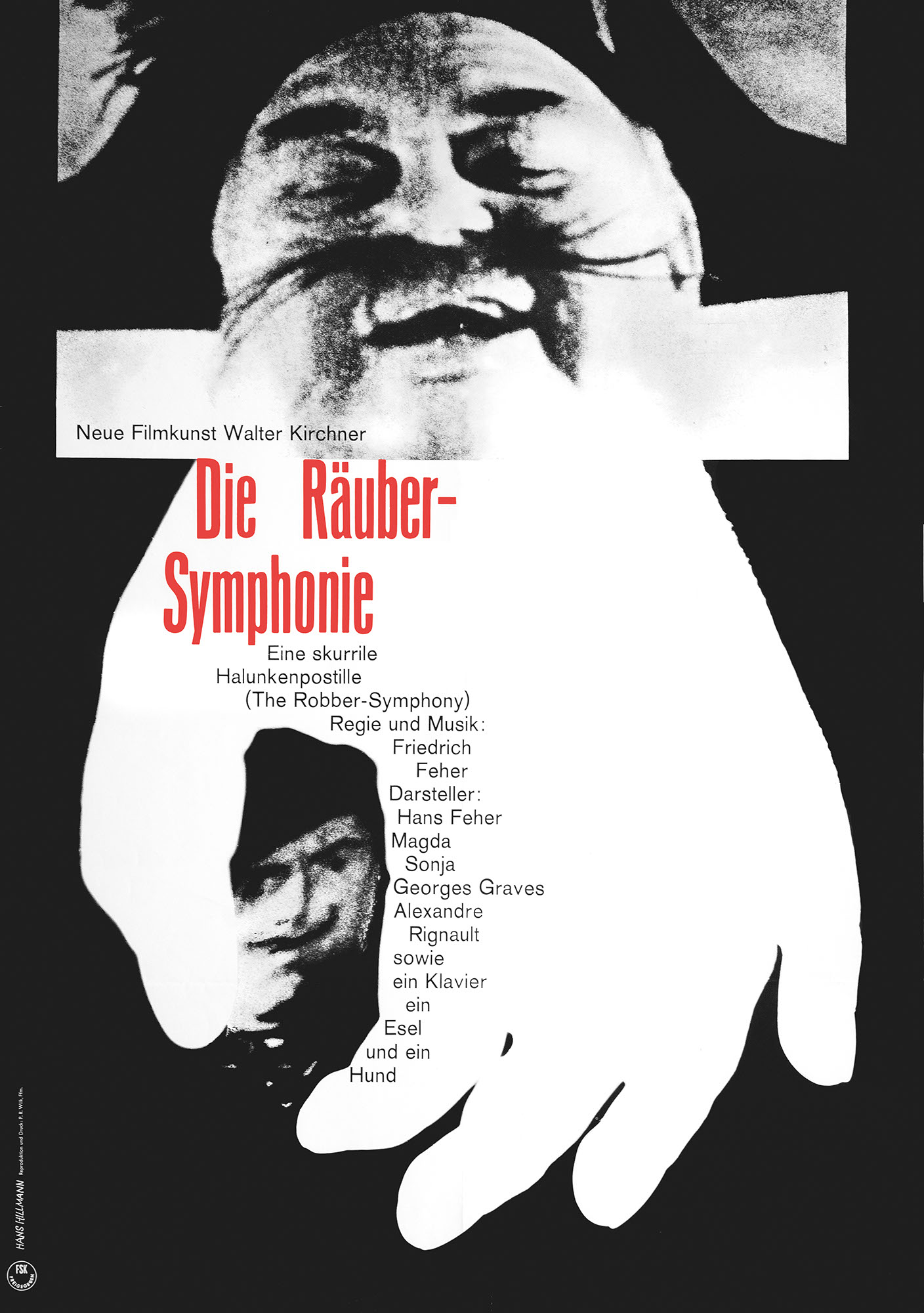 Die Räuber-SymphonieJahr: 1964Medium: PlakatMaße: 59,4x84,1 cm (DIN A1)Technik: OffsetdruckAuftraggeber: Neue Filmkunst Walter KirchnerOrt: GöttingenKeine Beschreibung