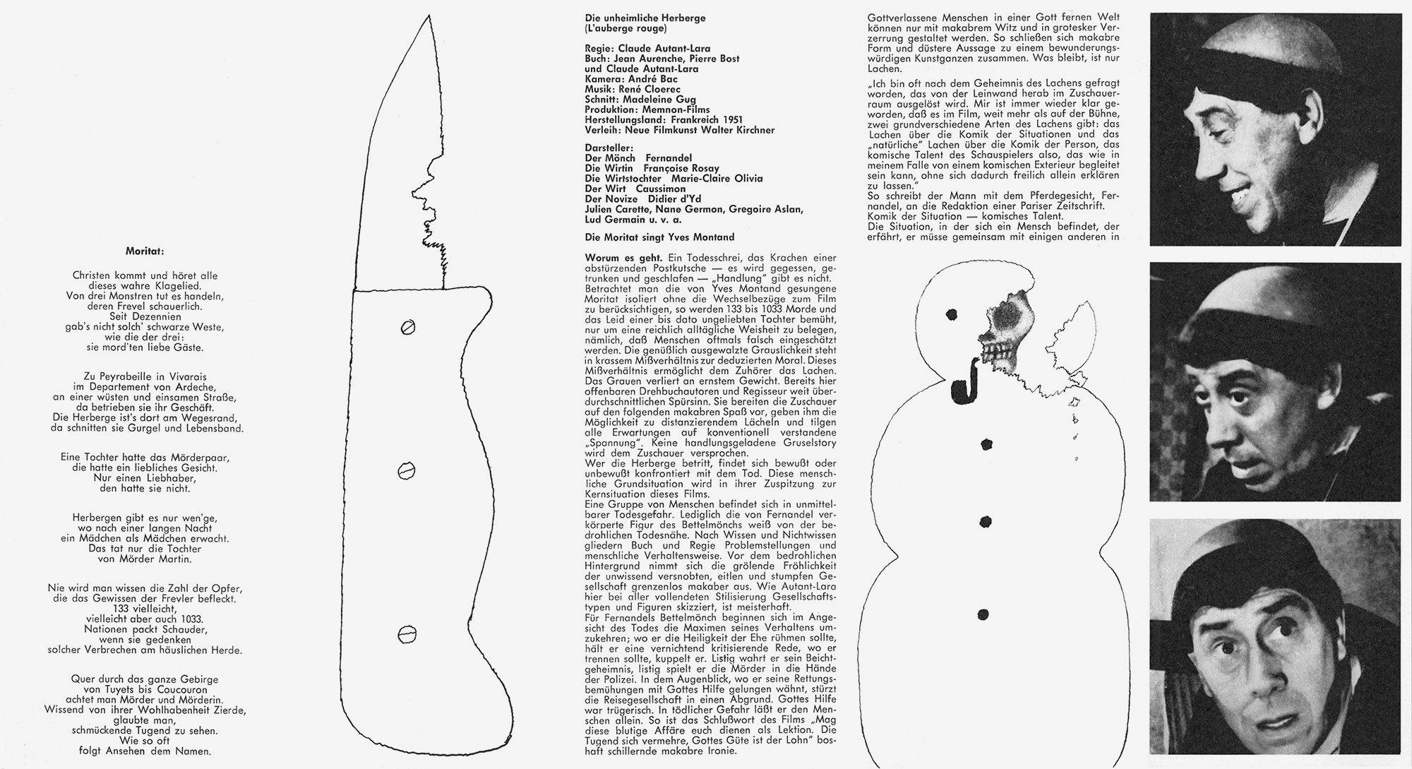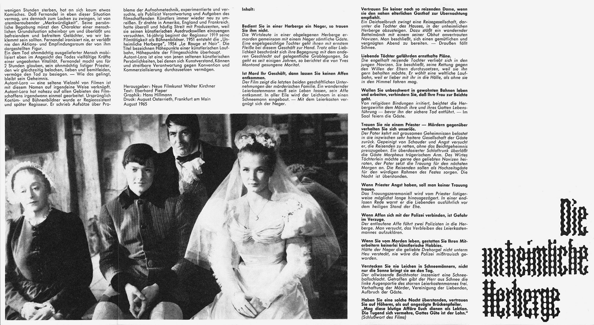 Die unheimliche Herberge (Faltblatt)Jahr: 1965Medium: FaltblattMaße: 8x23 cmTechnik: BuchdruckAuftraggeber: Neue Filmkunst Walter KirchnerOrt: GöttingenKeine Beschreibung