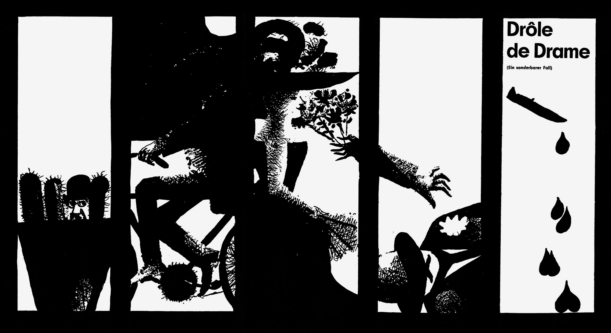 Drole de Drame – Ein sonderbarer Fall (Faltblatt)Jahr: 1960Medium: FaltblattMaße: 8x23 cmTechnik: BuchdruckAuftraggeber: Neue Filmkunst Walter KirchnerOrt: GöttingenKeine Beschreibung