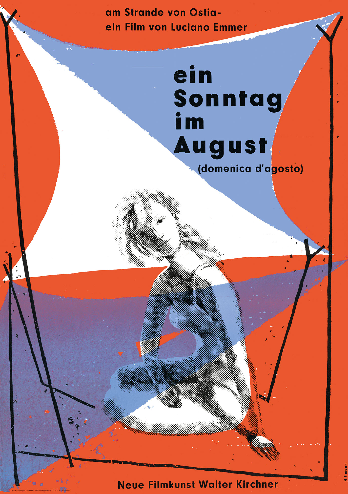 Ein Sonntag im AugustJahr: 1956Medium: PlakatMaße: 59,4x84,1 cm (DIN A1)Technik: SiebdruckAuftraggeber: Neue Filmkunst Walter KirchnerOrt: GöttingenKeine Beschreibung