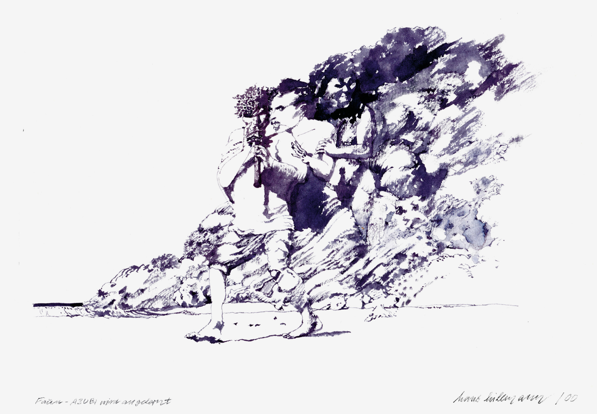 Faun-Azubi wird angelerntJahr: 2000Medium: IllustrationMaße: 28x19,5 cmTechnik: AquarellzeichnungAuftraggeber: EigenauftragOrt: Frankfurt am MainKeine Beschreibung