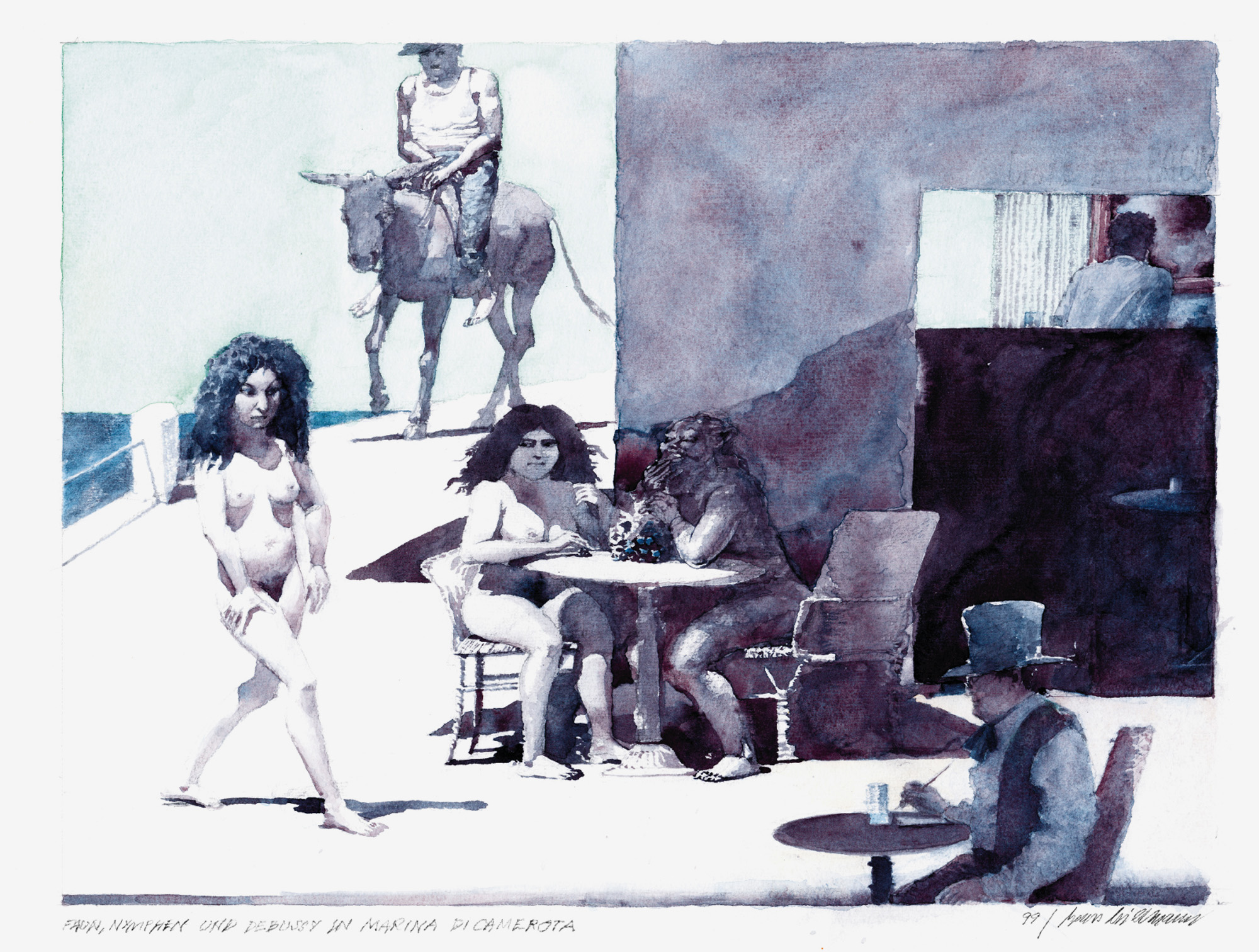 Faun, Nymphe und Debussy in Marina Di CamerotaJahr: 1999Medium: IllustrationMaße: 28x20 cmTechnik: AquarellzeichnungAuftraggeber: EigenauftragOrt: Frankfurt am MainKeine Beschreibung