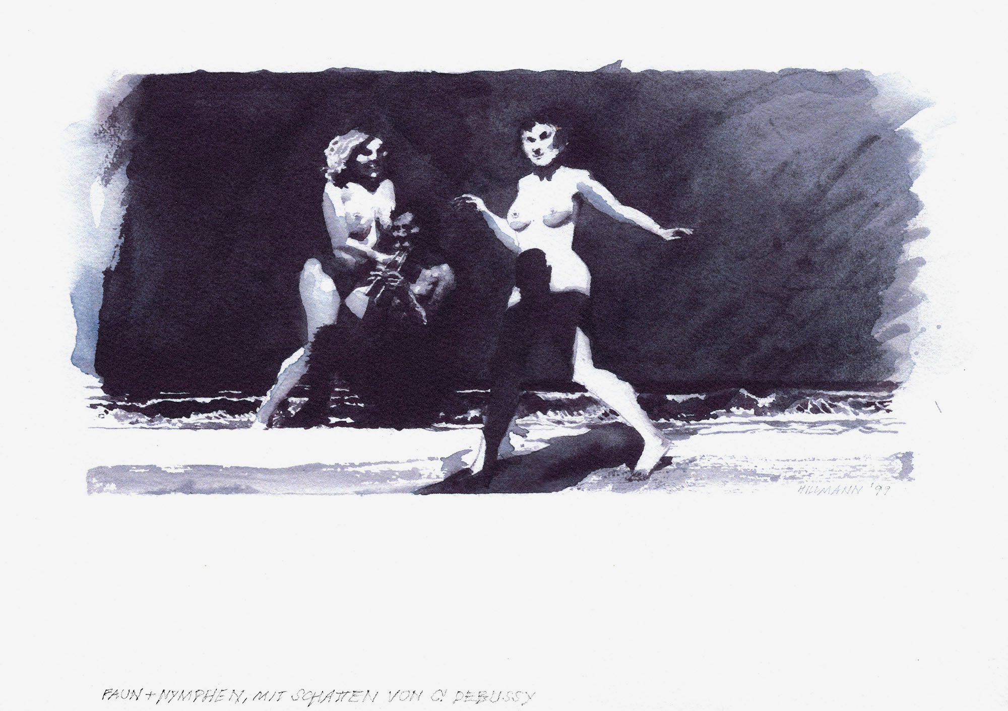 Faun+Nympfen mit Schatten von Claude DebussyJahr: 1999Medium: IllustrationMaße: 33x23 cmTechnik: AquarellzeichnungAuftraggeber: EigenauftragOrt: Frankfurt am MainKeine Beschreibung