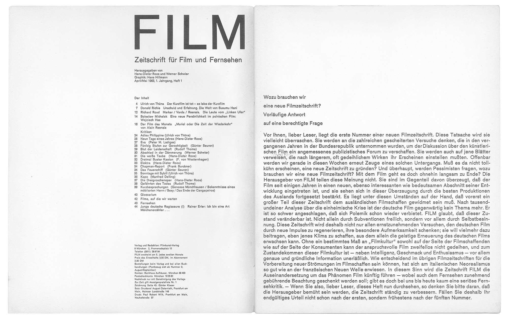 Film – Zeitschrift für Film und Fernsehen (Nr. 1, April–Mai 1963)Jahr: 1963Medium: MagazinMaße: 24x29,7 cmTechnik: OffsetdruckAuftraggeber: Film – Zeitschrift für Film und FernsehenOrt: Frankfurt am MainKeine Beschreibung