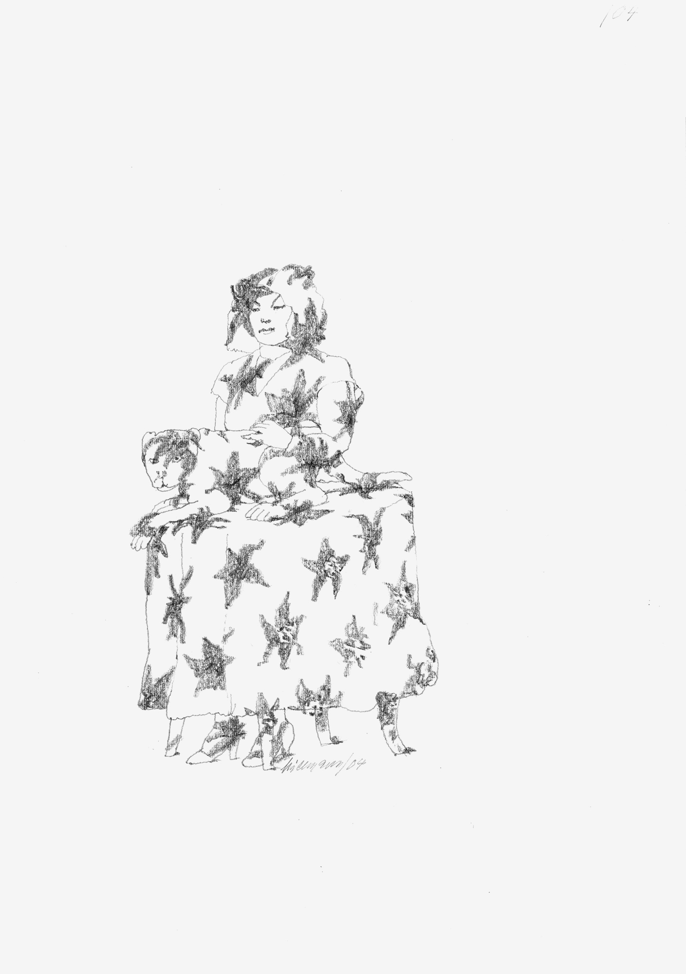 Frau mit Hund und MusterJahr: 2004Medium: IllustrationMaße: 21x29,7 cmTechnik: BleistiftskizzeAuftraggeber: EigenauftragOrt: Frankfurt am MainKeine Beschreibung