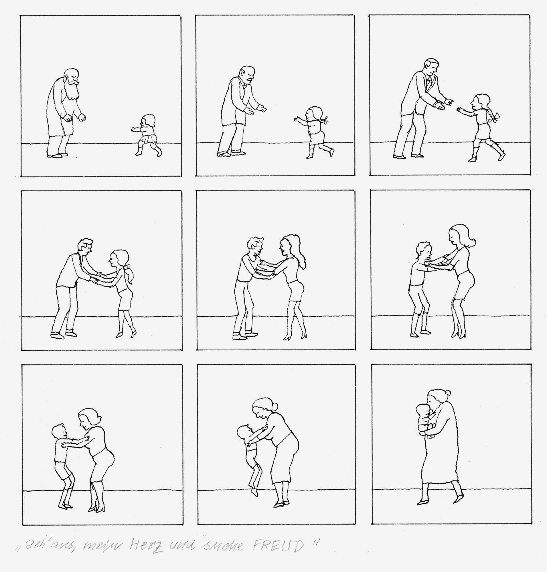 Geh aus mein Herz und suche FreudJahr: 1970Medium: BuchillustrationMaße: 19x20 cmTechnik: TuschezeichnungAuftraggeber: EigenauftragOrt: Frankfurt am MainBildergeschichte für das Buch »Ich hab geträumt ich wär ein Hund der träumt«.
