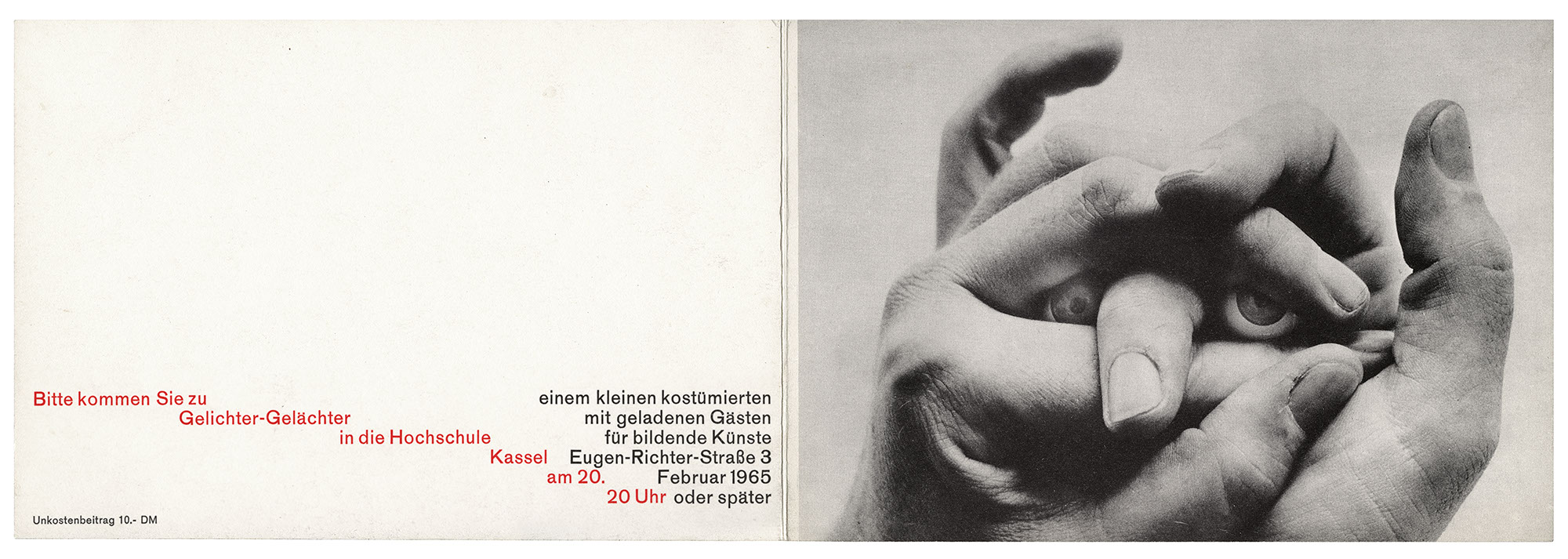 Gelichter GelächterJahr: 1965Medium: FaltblattMaße: 22x15 cmTechnik: OffsetdruckAuftraggeber: Hochschule KasselOrt: KasselEinladungskarte zu einer studentischen Veranstaltung der Hochschule Kassel