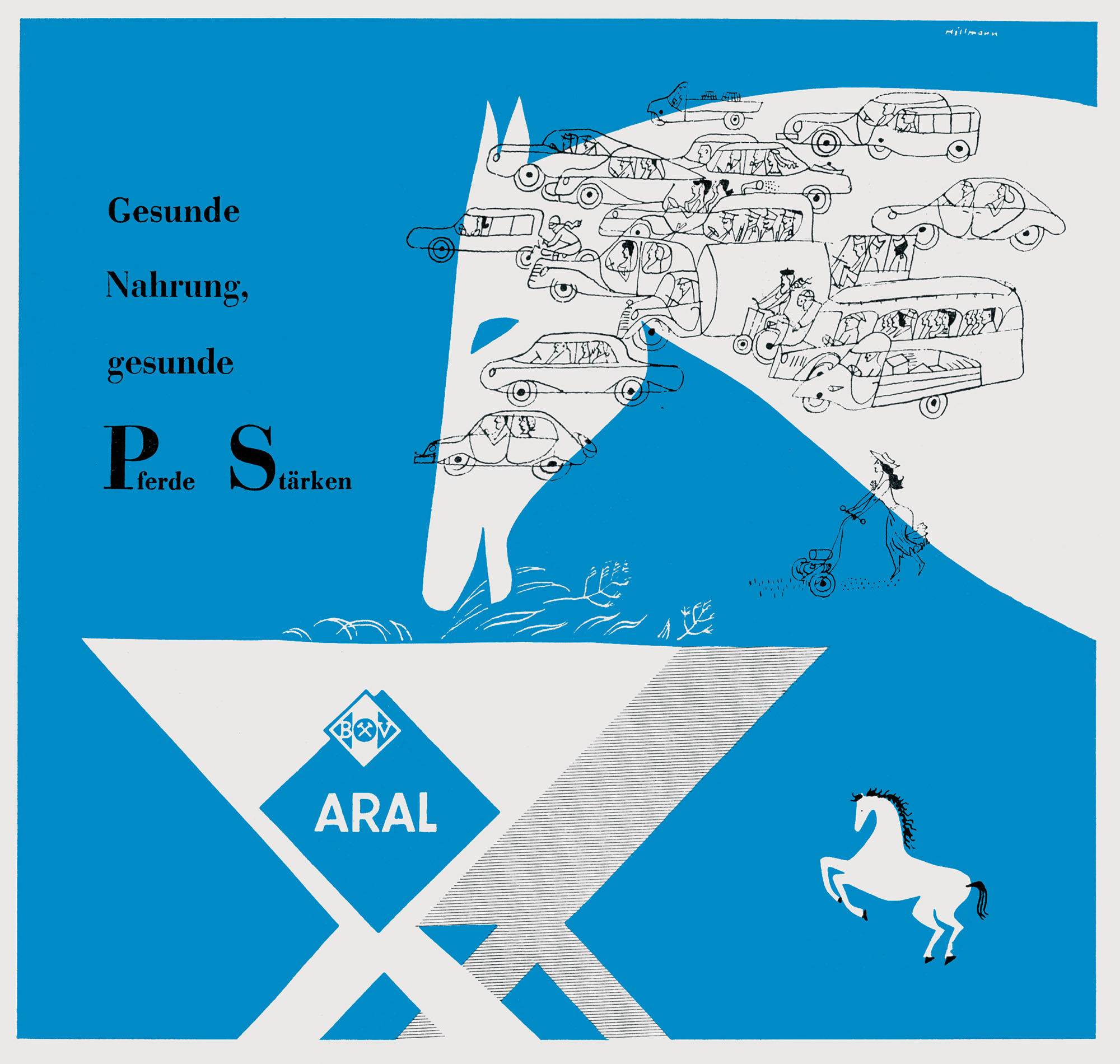 Gesunde Nahrung, gesunde Pferde StärkenJahr: 1955Medium: AnzeigeMaße: 20,5x19,5 cmTechnik: BuchdruckAuftraggeber: Deutsche AralOrt: KasselErschienen in einem von Hillmann gestalteten Katalog zur Bundesgartenschau Kassel 1955.