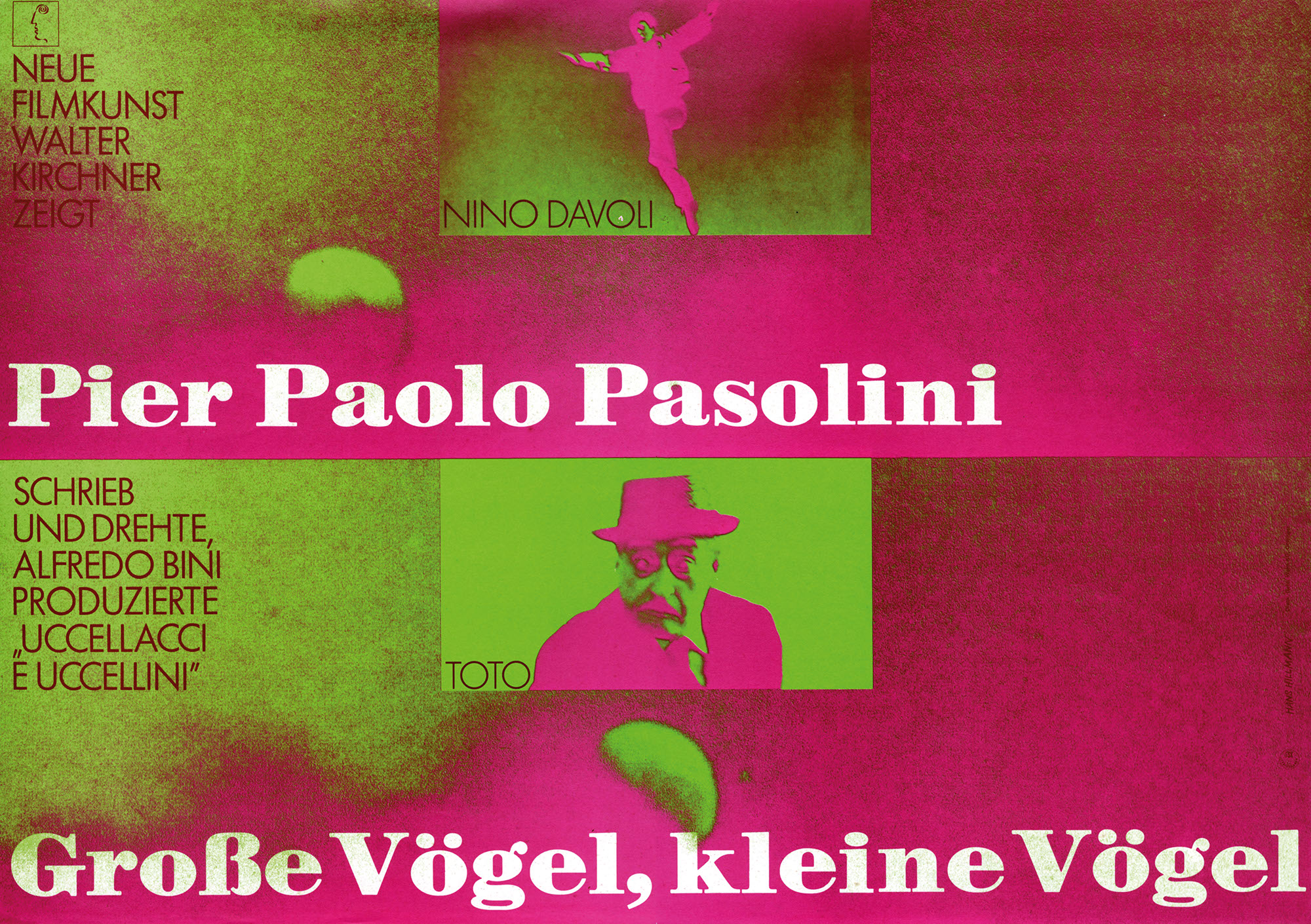 Große Vögel, kleine VögelJahr: 1969Medium: PlakatMaße: 59,4x42 cm (DIN A2)Technik: OffsetdruckAuftraggeber: Neue Filmkunst Walter KirchnerOrt: GöttingenKeine Beschreibung