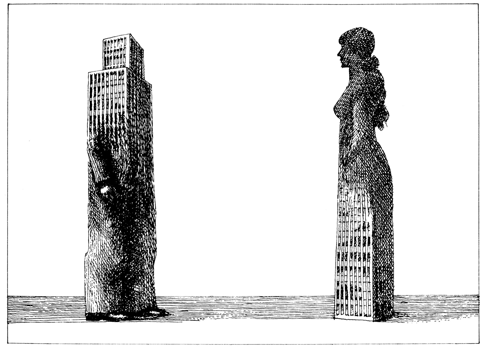 Hochhauspaar – Mensch und GroßstadtJahr: 1980Medium: IllustrationTechnik: TuschezeichnungAuftraggeber: EigenauftragOrt: Frankfurt am MainKeine Beschreibung
