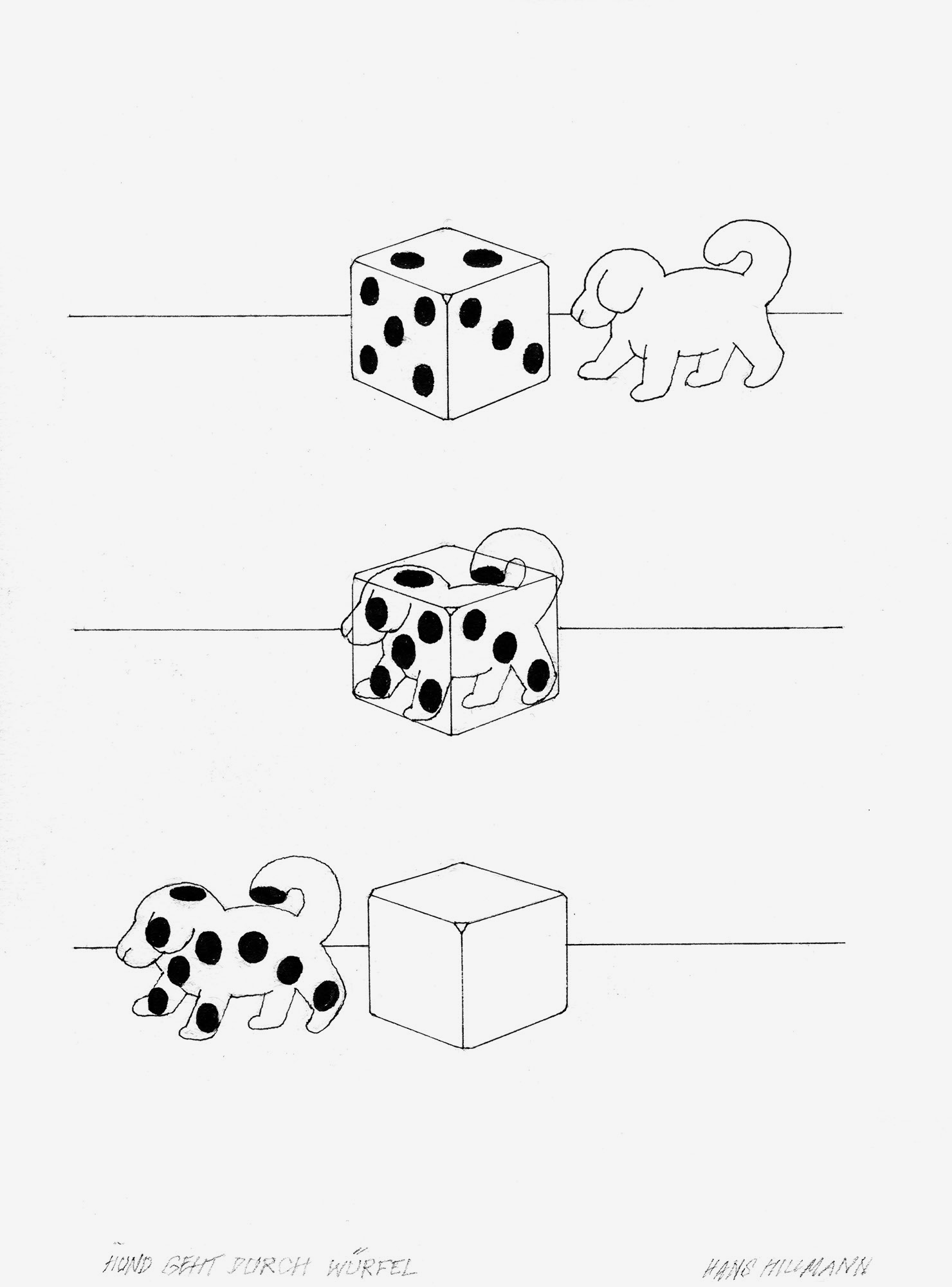 Hund geht durch WürfelJahr: 1970Medium: BuchillustrationMaße: 21,5x29 cmTechnik: TuschezeichnungAuftraggeber: EigenauftragOrt: Frankfurt am MainBildergeschichte für das Buch »Ich hab geträumt ich wär ein Hund der träumt«.