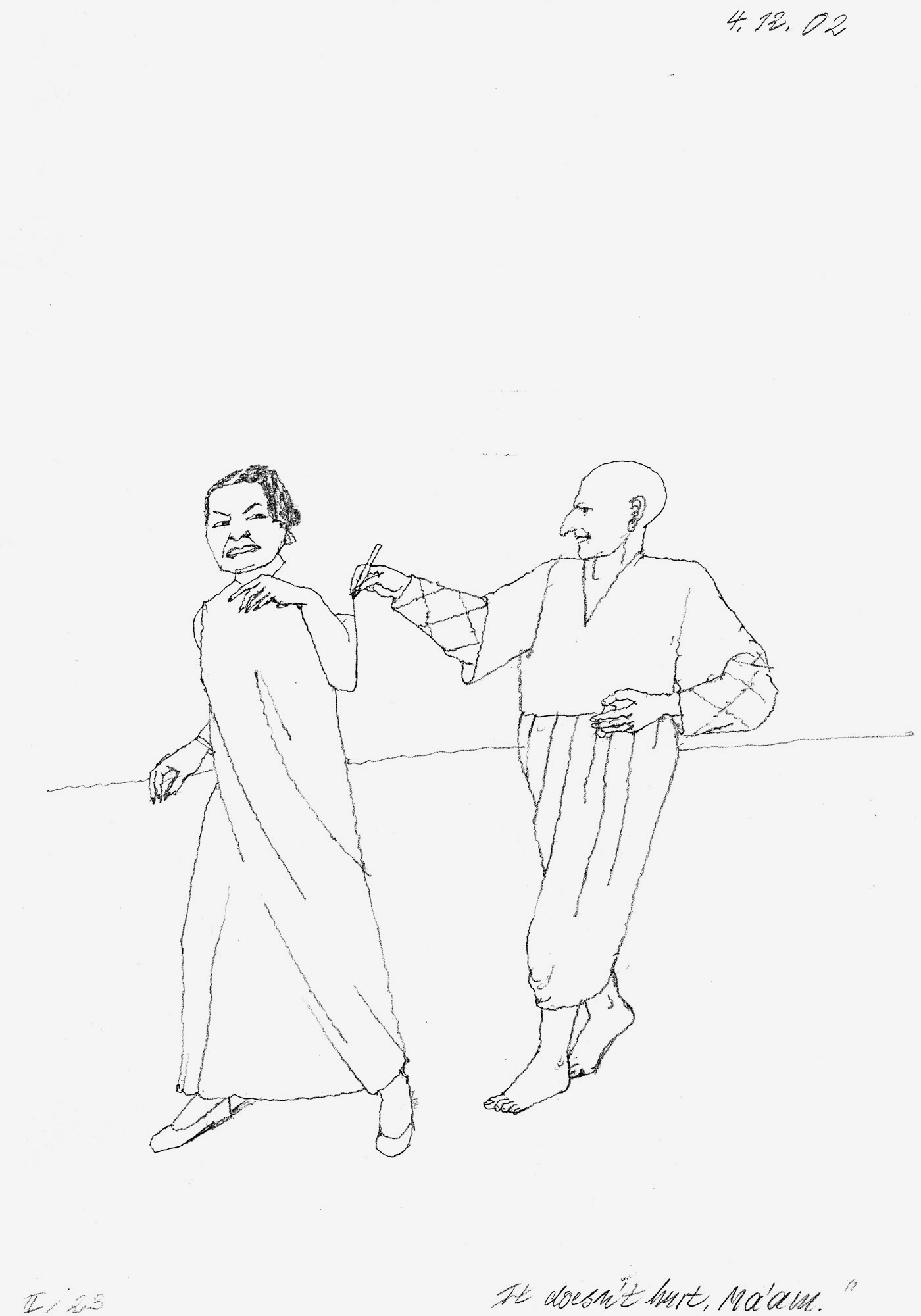 It does’nt hurt, MaamJahr: 2002Medium: IllustrationMaße: 21x29,7 cmTechnik: BleistiftskizzeAuftraggeber: EigenauftragOrt: Frankfurt am MainKeine Beschreibung
