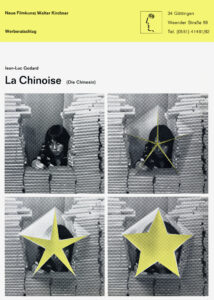 La ChinoiseJahr: 1968Medium: PlakatMaße: 59,4x84,1 cm (DIN A1)Technik: OffsetdruckAuftraggeber: Neue Filmkunst Walter KirchnerOrt: GöttingenKeine Beschreibung