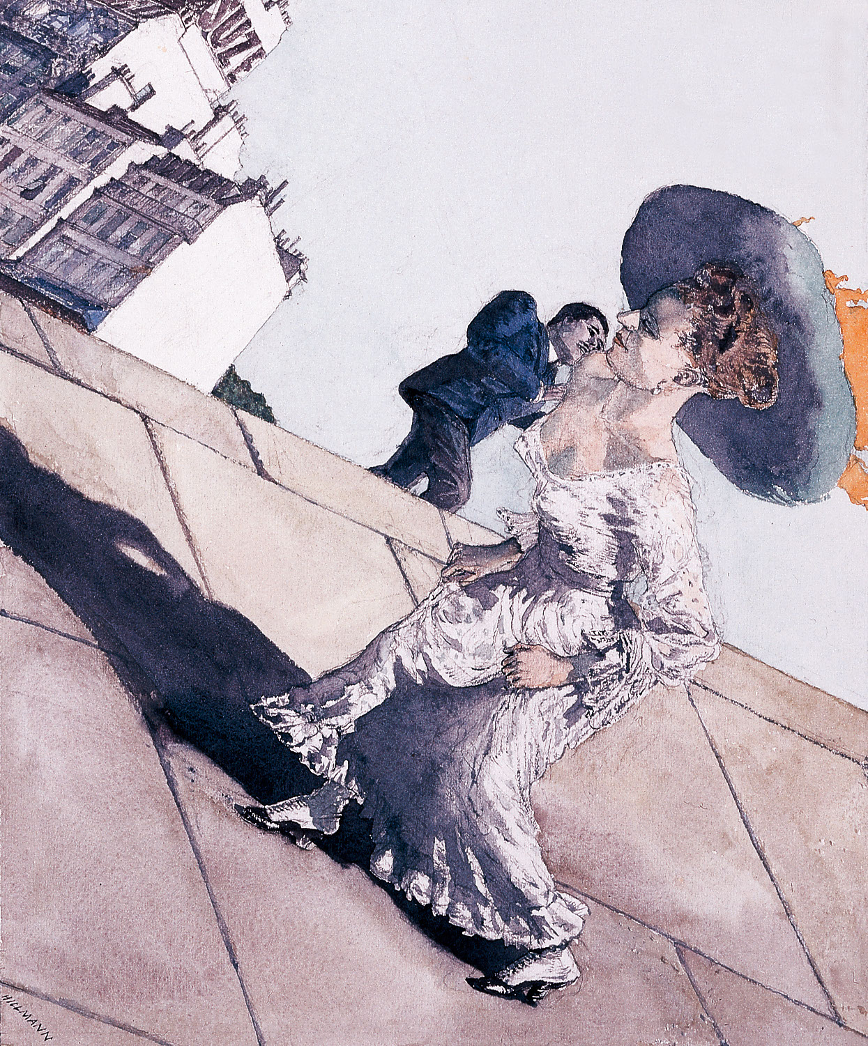 Liebesgeschichten – AppollinaireJahr: 1987Medium: MagazinillustrationTechnik: AquarellzeichnungAuftraggeber: Frankfurter Allgemeine MagazinOrt: Frankfurt am MainAus der Serie »Liebesgeschichten«. Abgedruckt im »FAZ Magazin« Nr. 532.