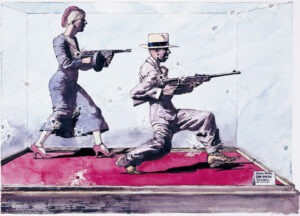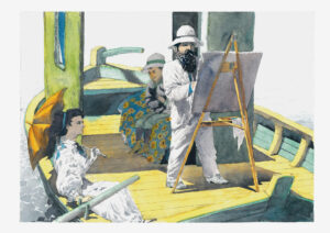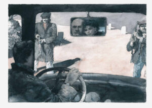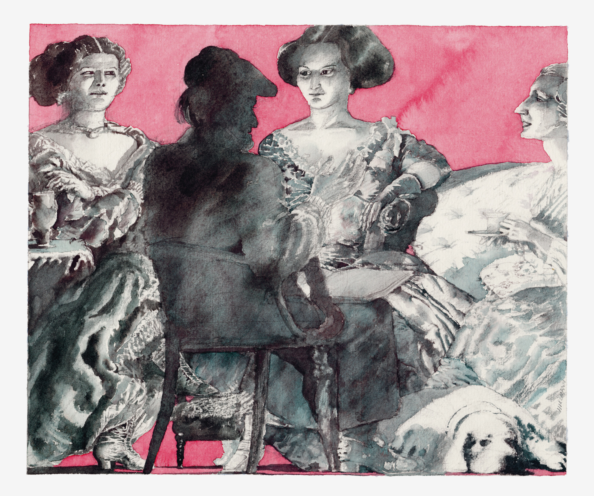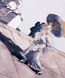 Liebesgeschichten – Die WagnersJahr: 1990Medium: IllustrationMaße: 24,5x20,5 cmTechnik: AquarellzeichnungAuftraggeber: Frankfurter Allgemeine MagazinOrt: Frankfurt am MainAus der Serie »Liebesgeschichten«. Abgedruckt im »FAZ Magazin«.