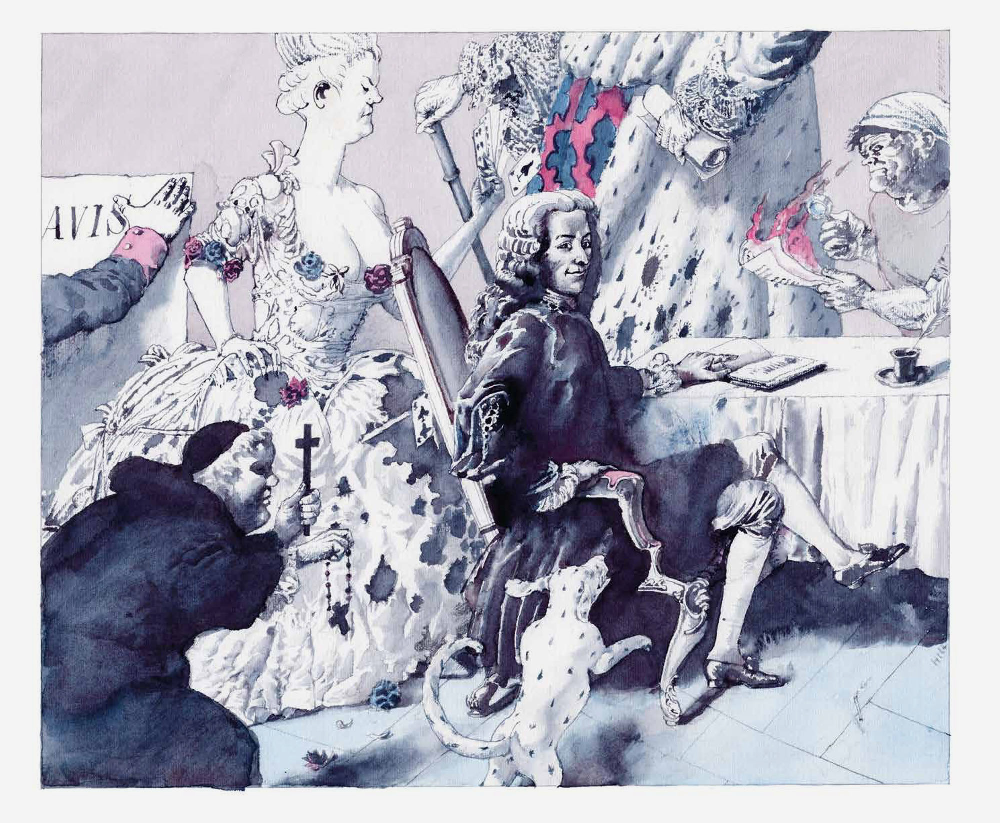 Liebesgeschichten – Emilie Du Chatelet & VoltaireJahr: 1990Medium: IllustrationMaße: 25x21 cmTechnik: AquarellzeichnungAuftraggeber: Frankfurter Allgemeine MagazinOrt: Frankfurt am MainAus der Serie »Liebesgeschichten«. Abgedruckt im »FAZ Magazin«.