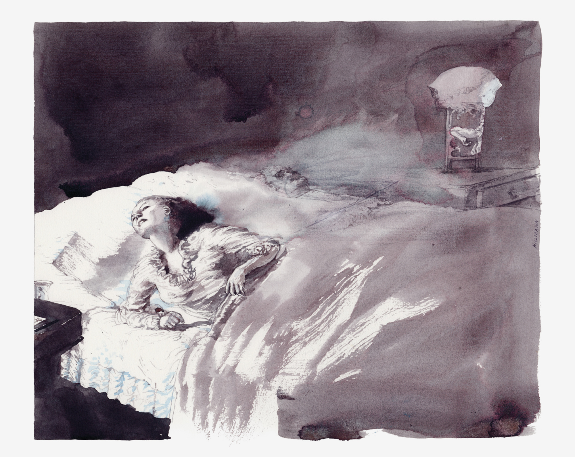 Liebesgeschichten – Frieda Zimmer & Hugo WolfJahr: 1990Medium: IllustrationMaße: 28x20 cmTechnik: AquarellzeichnungAuftraggeber: Frankfurter Allgemeine MagazinOrt: Frankfurt am MainAus der Serie »Liebesgeschichten«. Abgedruckt im »FAZ Magazin«.