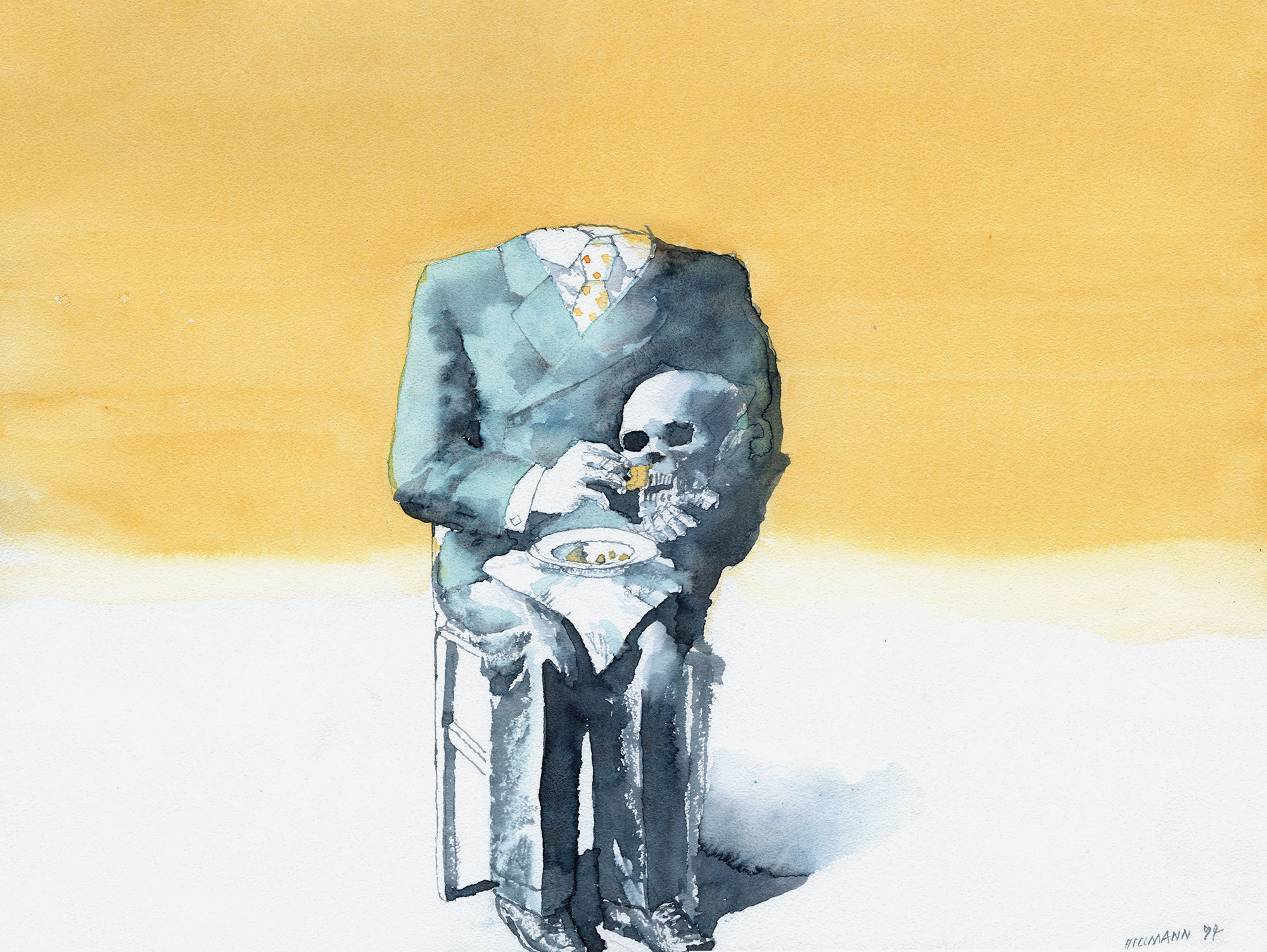 Mann füttert SkelettJahr: 1994Medium: IllustrationMaße: 39x29,5 cmTechnik: AquarellzeichnungAuftraggeber: EigenauftragOrt: Frankfurt am MainKeine Beschreibung