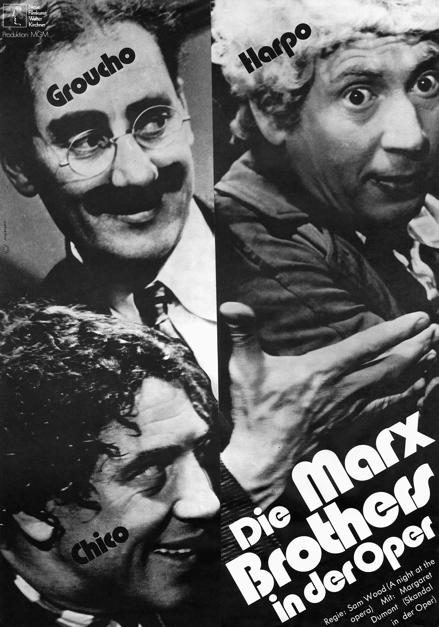 Marx Brothers in der OperJahr: 1973Medium: PlakatMaße: 59,4x84,1 cm (DIN A1)Technik: OffsetdruckAuftraggeber: Neue Filmkunst Walter KirchnerOrt: GöttingenKeine Beschreibung