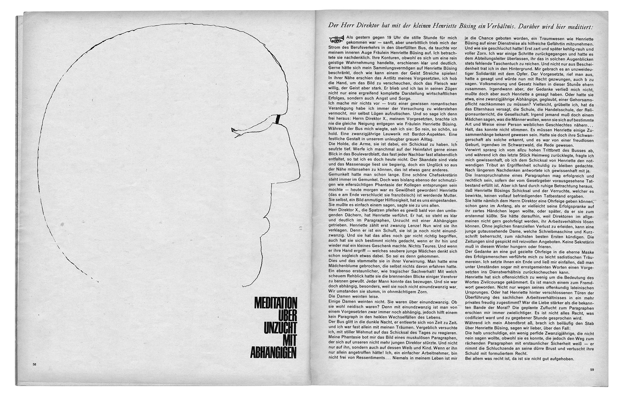 Meditation über Unzucht mit AbhängigenJahr: 1962Medium: MagazinillustrationMaße: 52x33,5 cmTechnik: TiefdruckAuftraggeber: TwenOrt: KölnAus »twen« Nr. 12-1962. Art Director: Willy Fleckhaus.