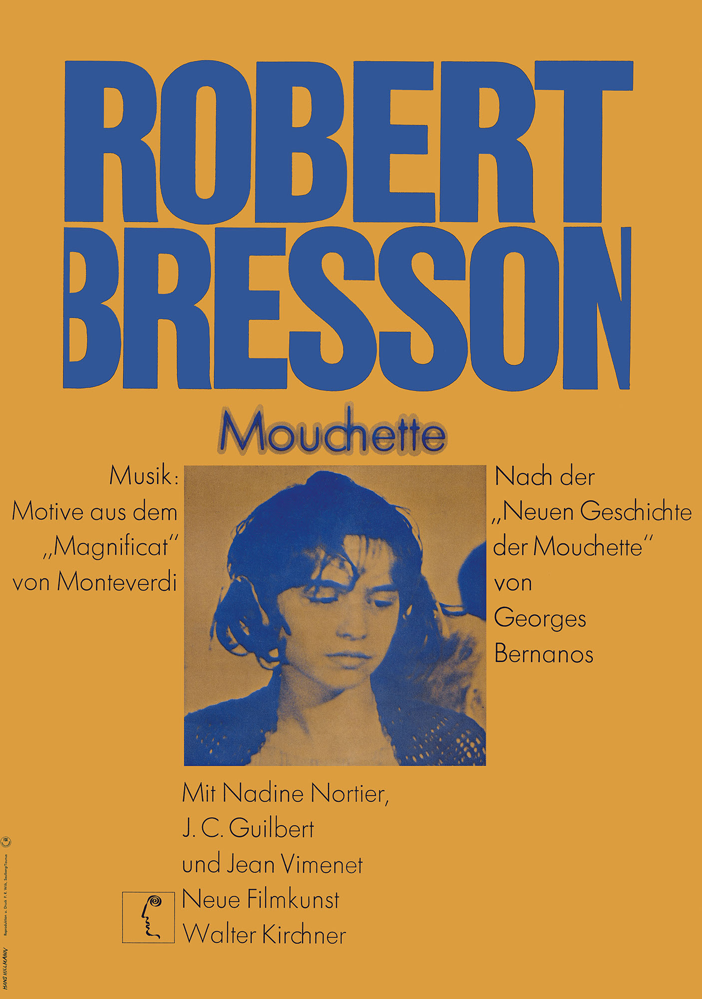 MouchetteJahr: 1969Medium: PlakatMaße: 59,4x84,1 cm (DIN A1)Technik: OffsetdruckAuftraggeber: Neue Filmkunst Walter KirchnerOrt: GöttingenKeine Beschreibung