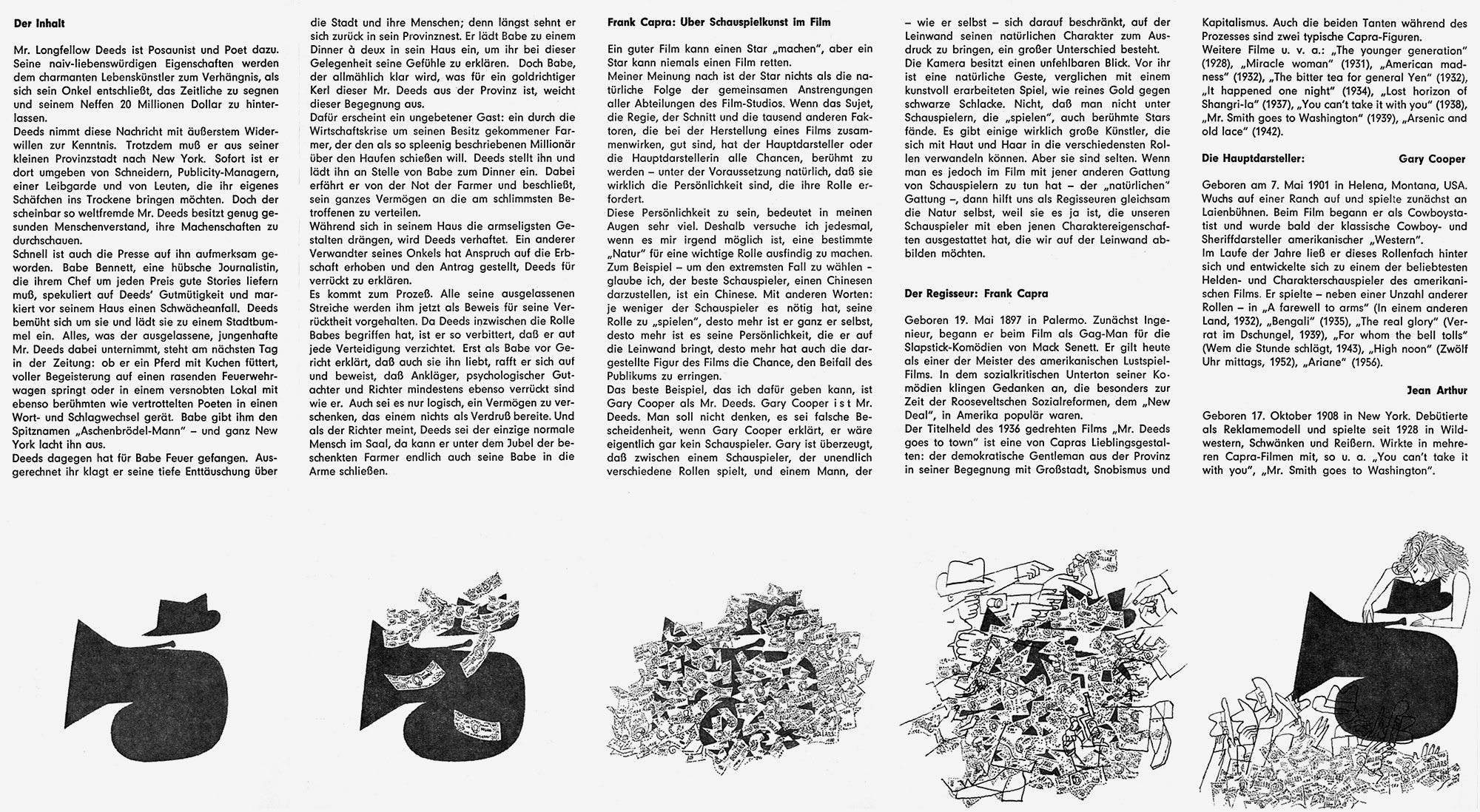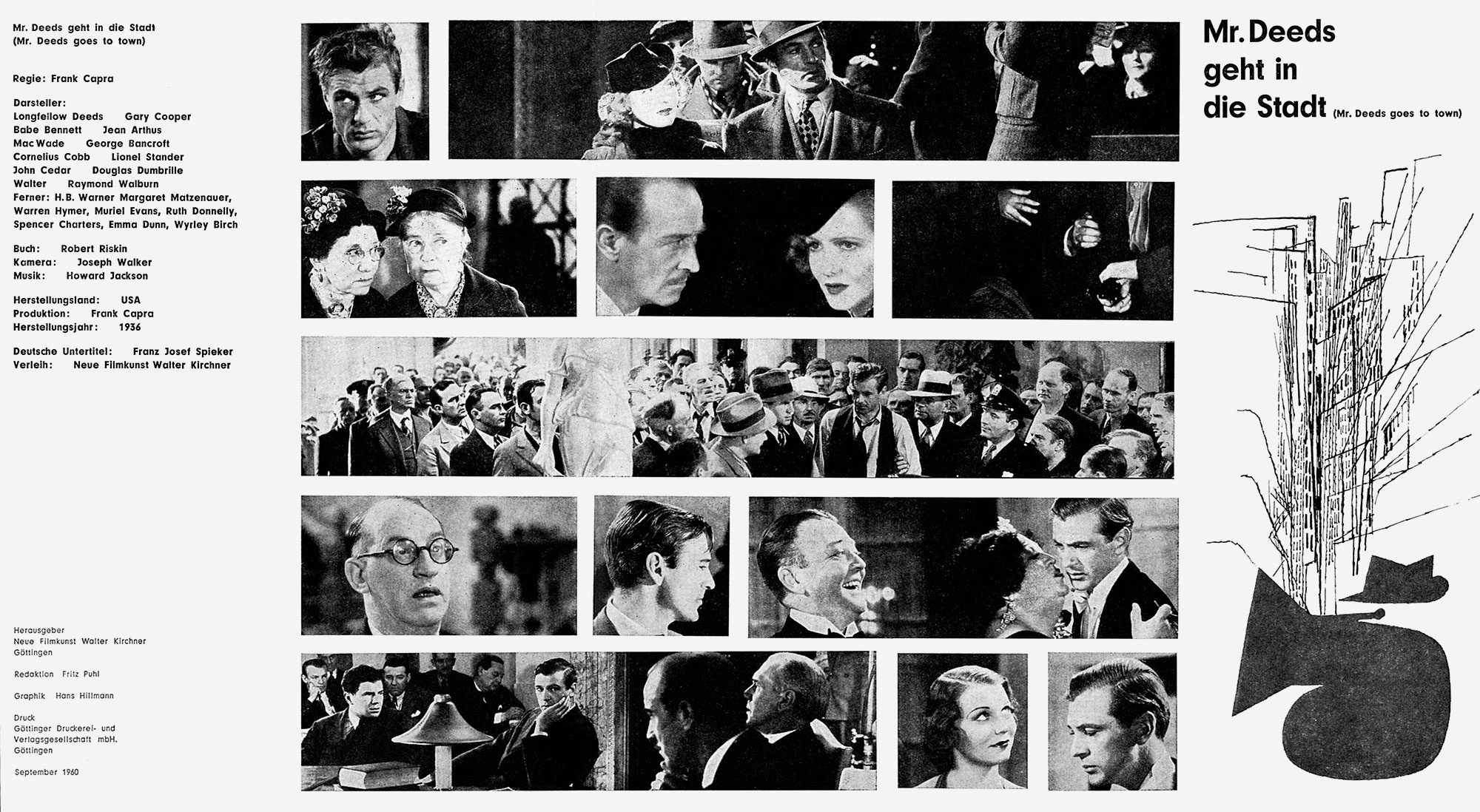 Mr. Deeds geht in die Stadt (Faltblatt)Jahr: 1960Medium: FaltblattMaße: 8x23 cmTechnik: BuchdruckAuftraggeber: Neue Filmkunst Walter KirchnerOrt: GöttingenKeine Beschreibung