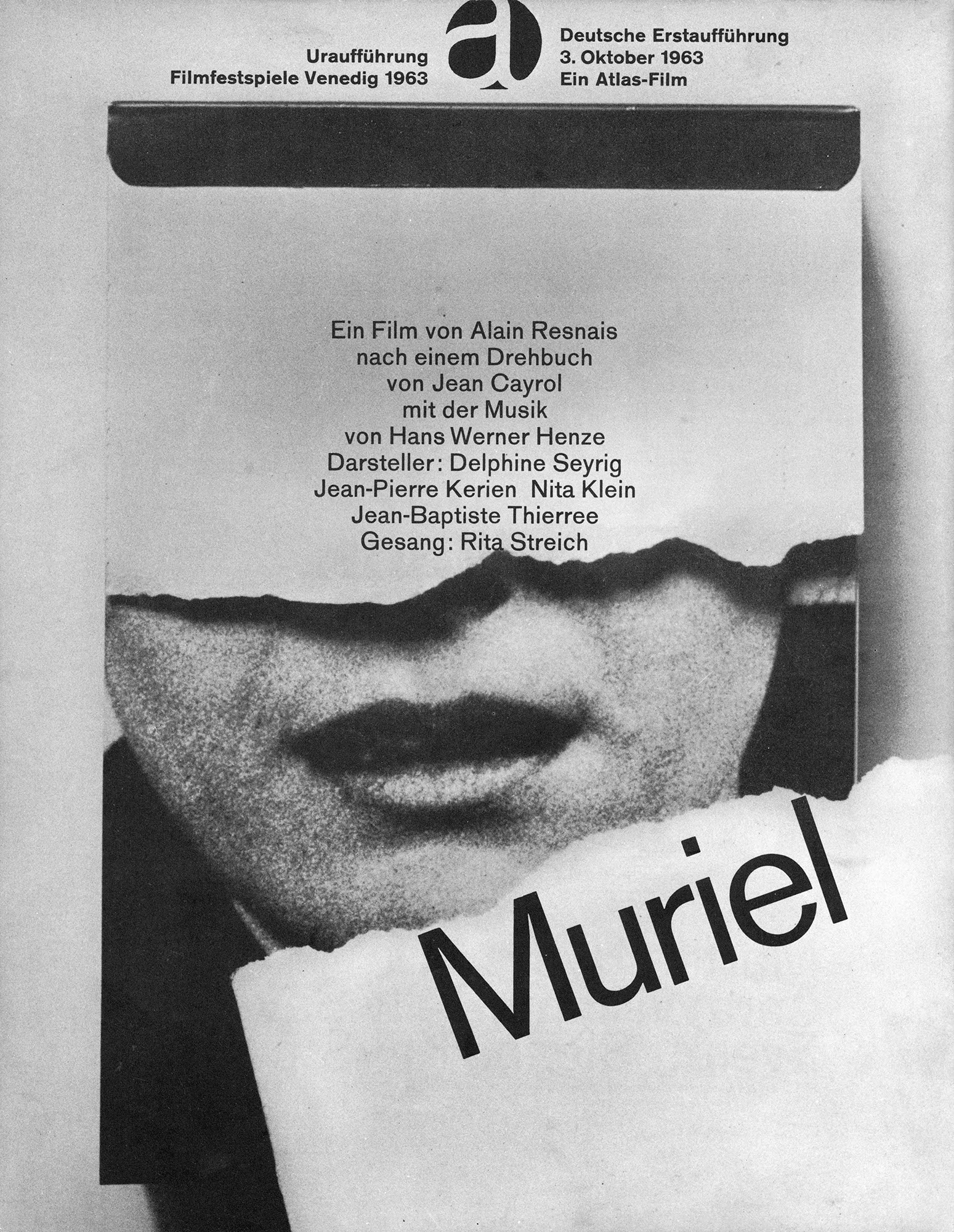 Muriel (Anzeige)Jahr: 1963Medium: AnzeigeMaße: 24x29,7 cmTechnik: OffsetdruckAuftraggeber: Atlas FilmOrt: DuisburgKeine Beschreibung