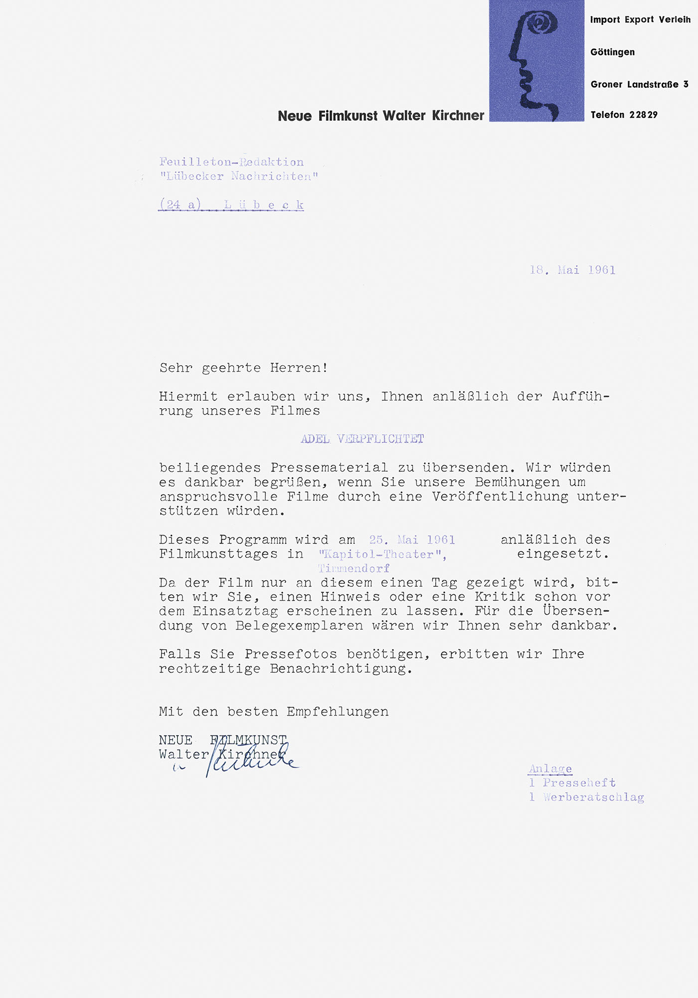 Neue Filmkunst (Briefbogen)Jahr: 1961Medium: BriefbogenMaße: 21x29,7 cmTechnik: BuchdruckAuftraggeber: Neue Filmkunst Walter KirchnerOrt: GöttingenKeine Beschreibung
