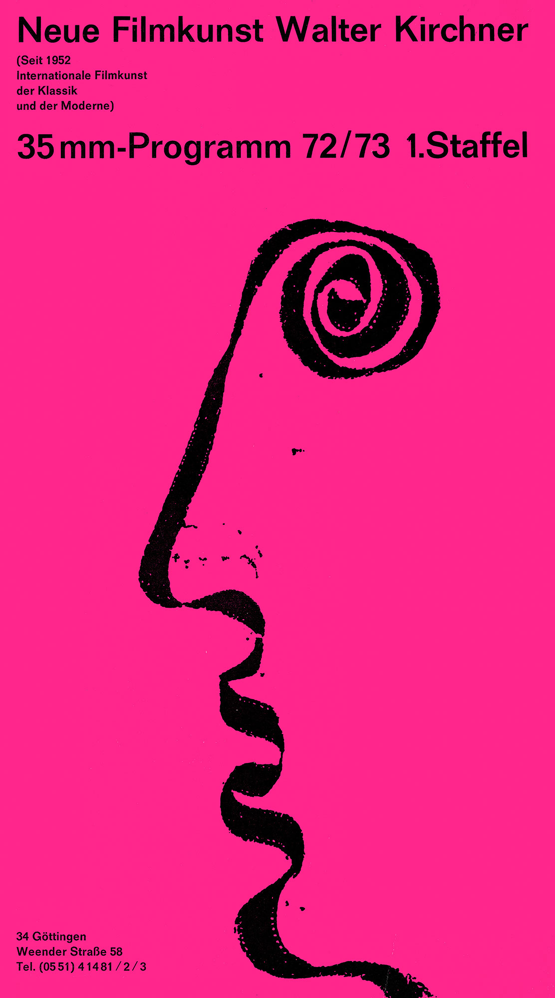 Neue Filmkunst Walter Kirchner – 35 mm-Programm 72/73 1. StaffelJahr: 1972Medium: BroschüreMaße: 18x30 cmTechnik: OffsetdruckAuftraggeber: Neue Filmkunst Walter KirchnerOrt: GöttingenKeine Beschreibung